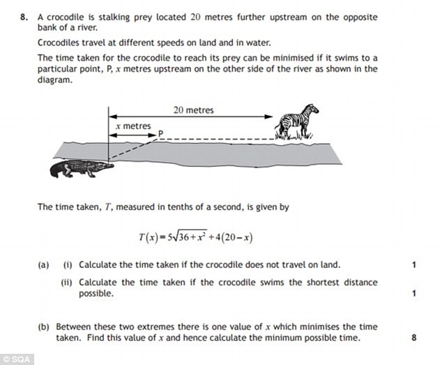 Bài toán con cá sấu là một phần trong đề kiểm tra toán ở cấp Higher (dành cho học sinh hai năm cuối cấp 2 ở Scotland, từ 15 đến 17 tuổi).