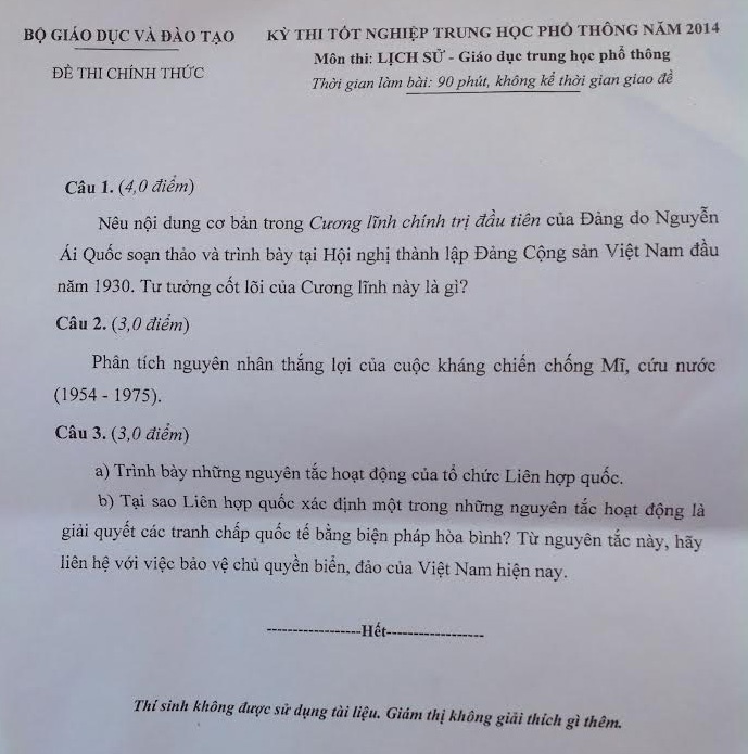 Dưới đây là đề thi môn Lịch sử. Gợi ý đáp án sẽ được chúng tôi cập nhật trong khoảng 30 phút tới.