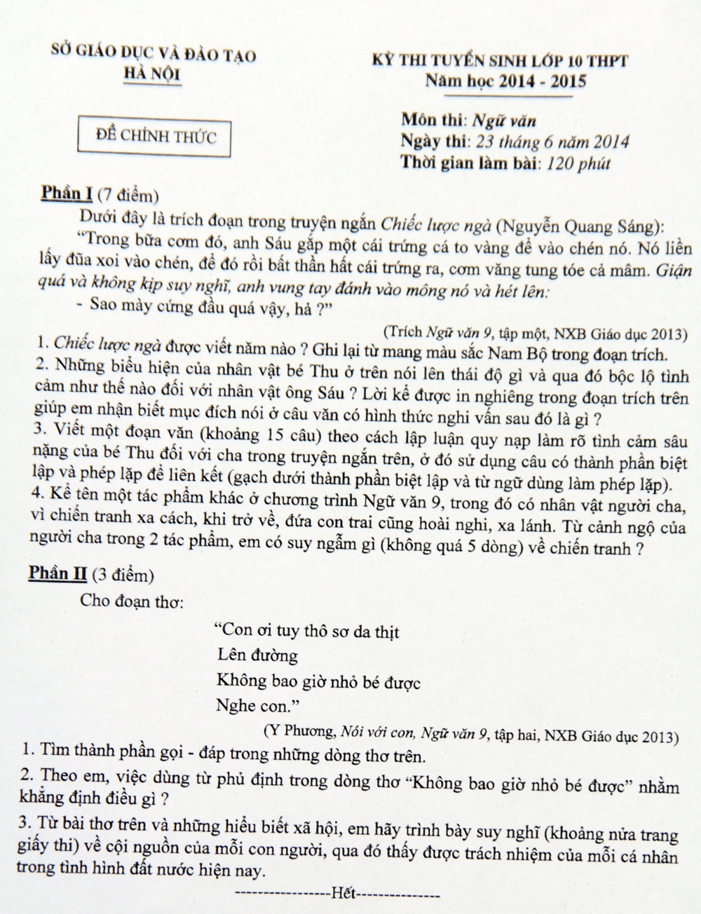 Xem đề thi môn Văn vào lớp 10 tại Hà Nội: