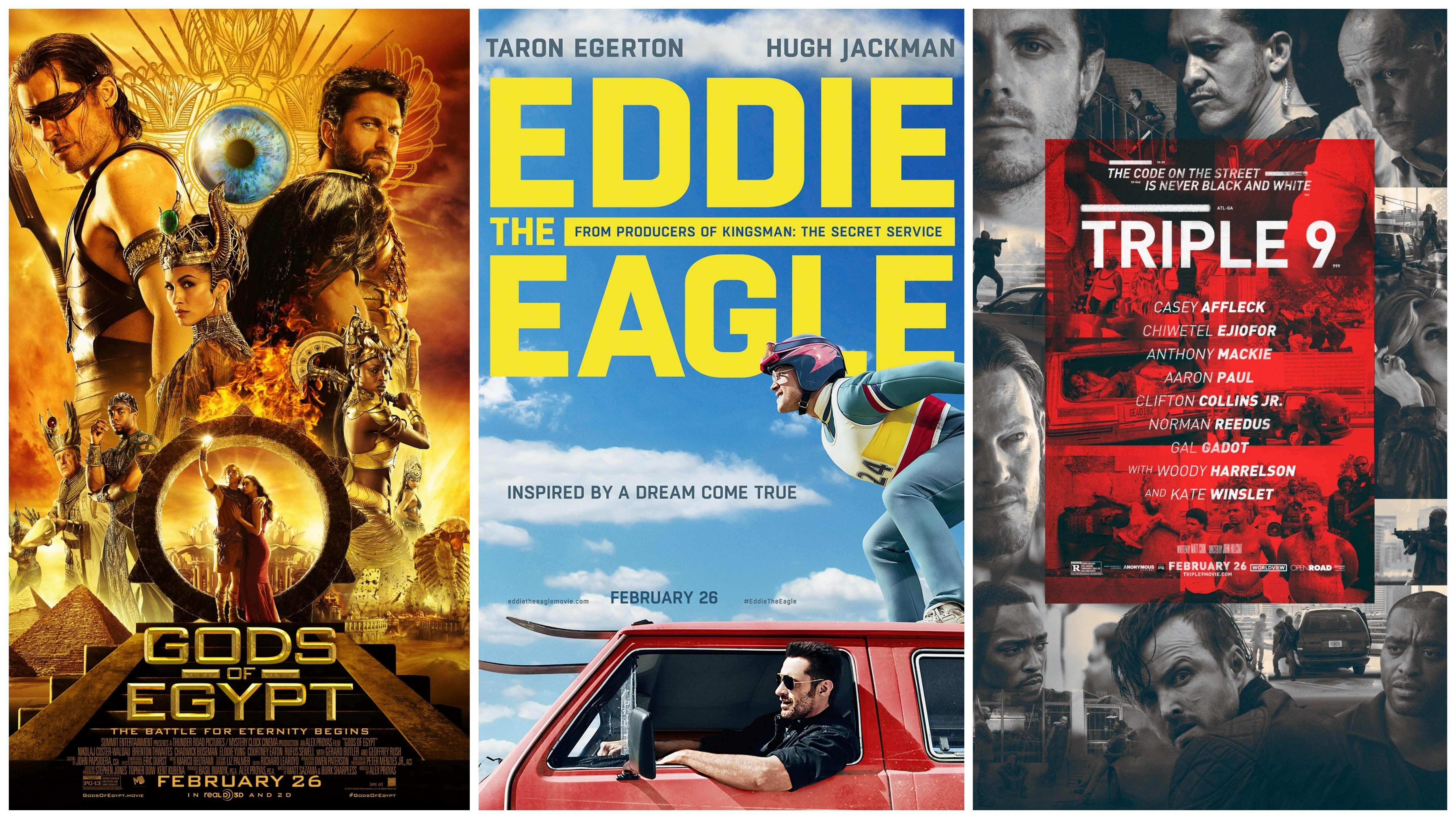 Cuối tuần này, các rạp chiếu phim tại Bắc Mỹ tiếp tục sôi động khi đón nhận ba tác phẩm mới: phim hành động, thần thoại, giả tưởng Gods of Egypt của Gerard Butler; phim tiểu sử Eddie the Eagle của Hugh Jackman; và Triple 9 - tác phẩm giật gân, trinh thám của Kate Winslet, Casey Affleck, Chiwetel Ejiofor…