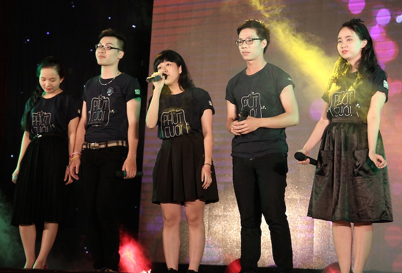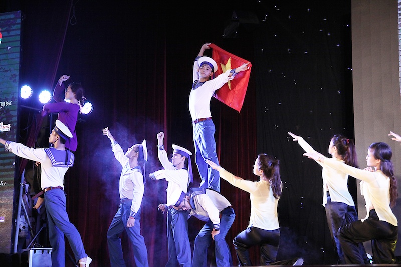 | Phút cuối 2014 là đêm nhạc hội được đầu tư và dàn dựng công phu, với nhiều cảm xúc cùng những lời tri ân chân thành dành đến sinh viên khóa cuối của học viện. Trong ảnh là tiết mục Hướng về biển đảo đậm chất sinh viên trường Đảng. Khi còn là sinh viên, họ đã biểu diễn những tiết mục đong đầy cảm xúc, và khi rời khỏi mái trường, sinh viên Học viện Báo chí và tuyên truyền sẽ là những chiến sĩ dũng cảm và kiên cường trên mọi mặt trận. |