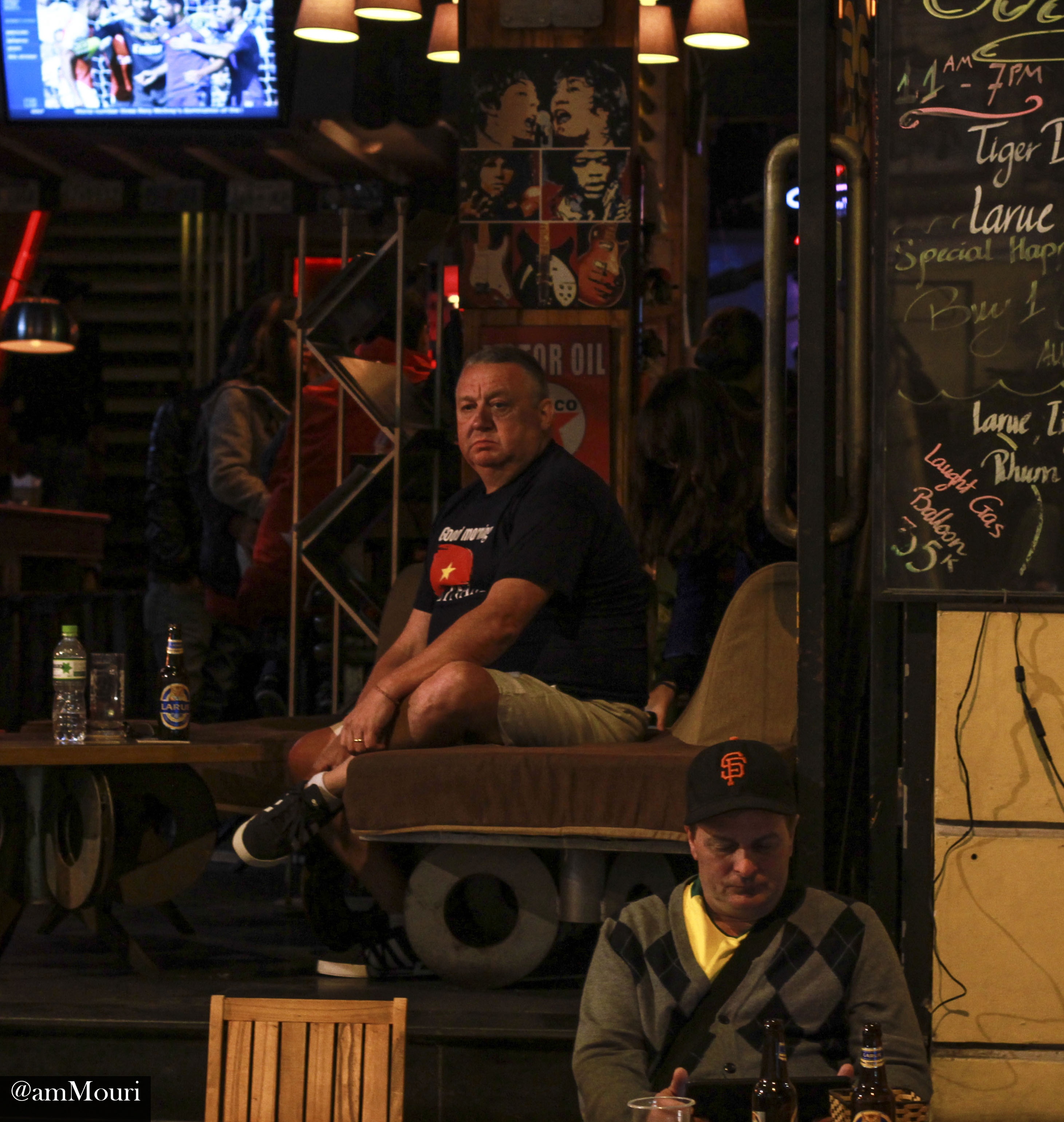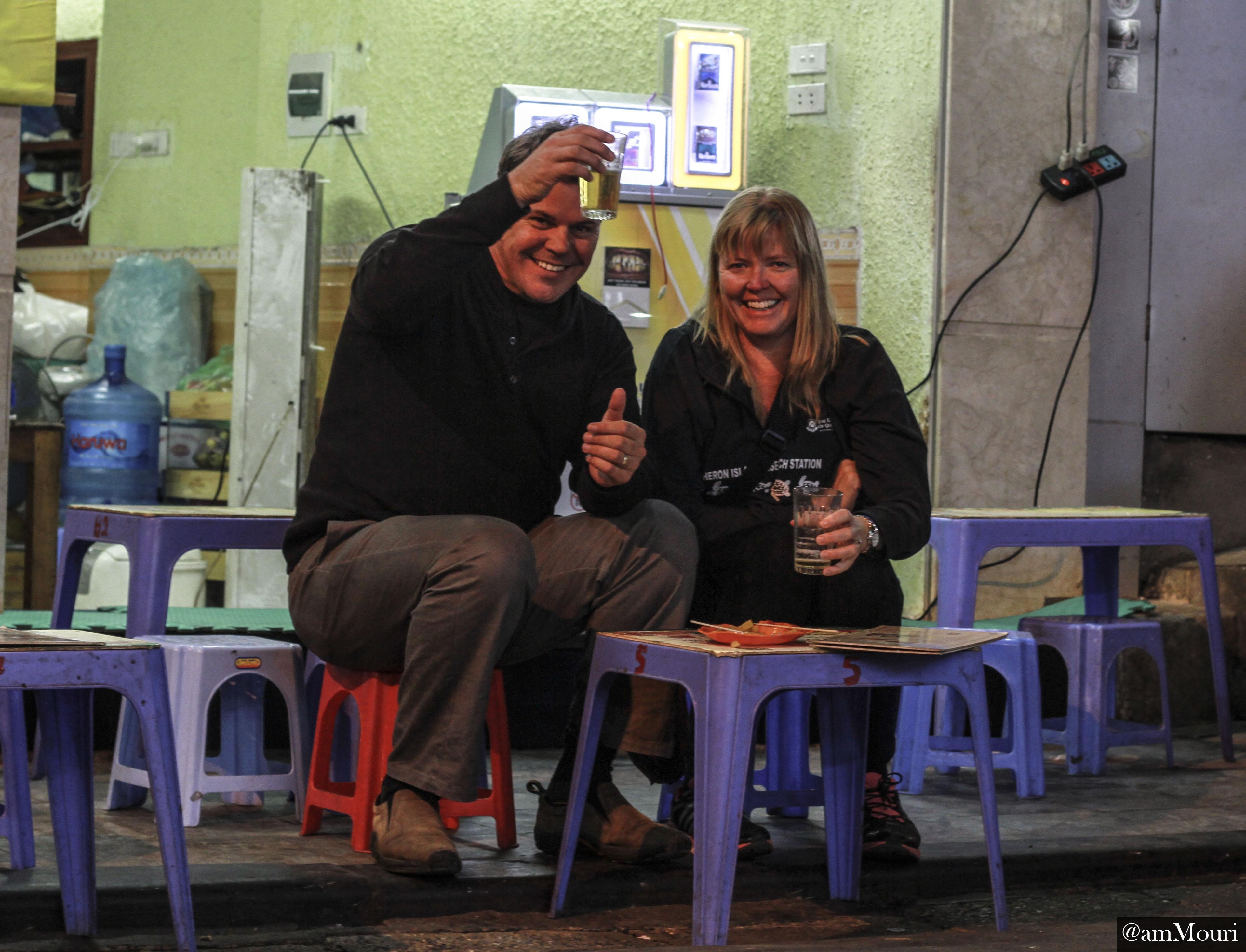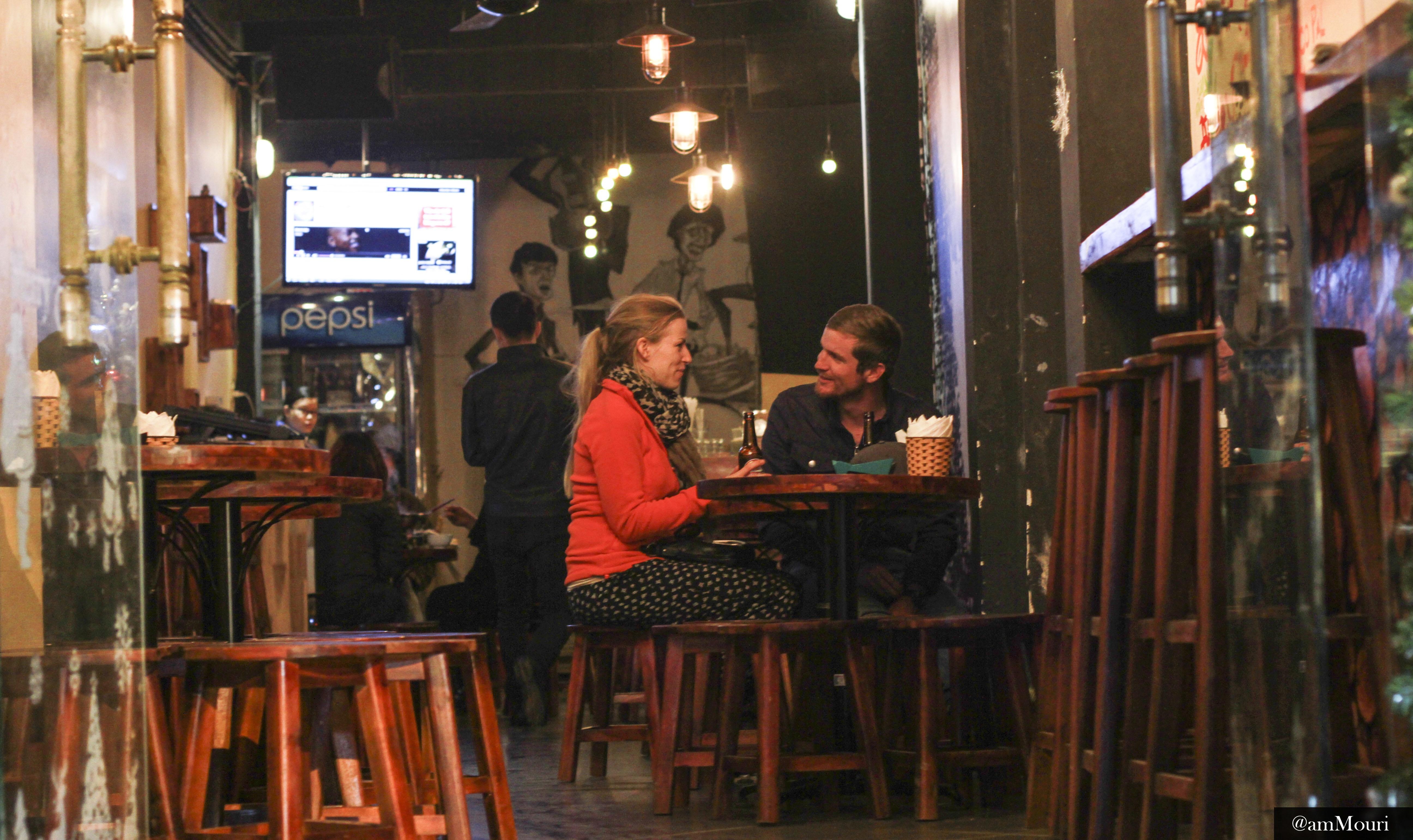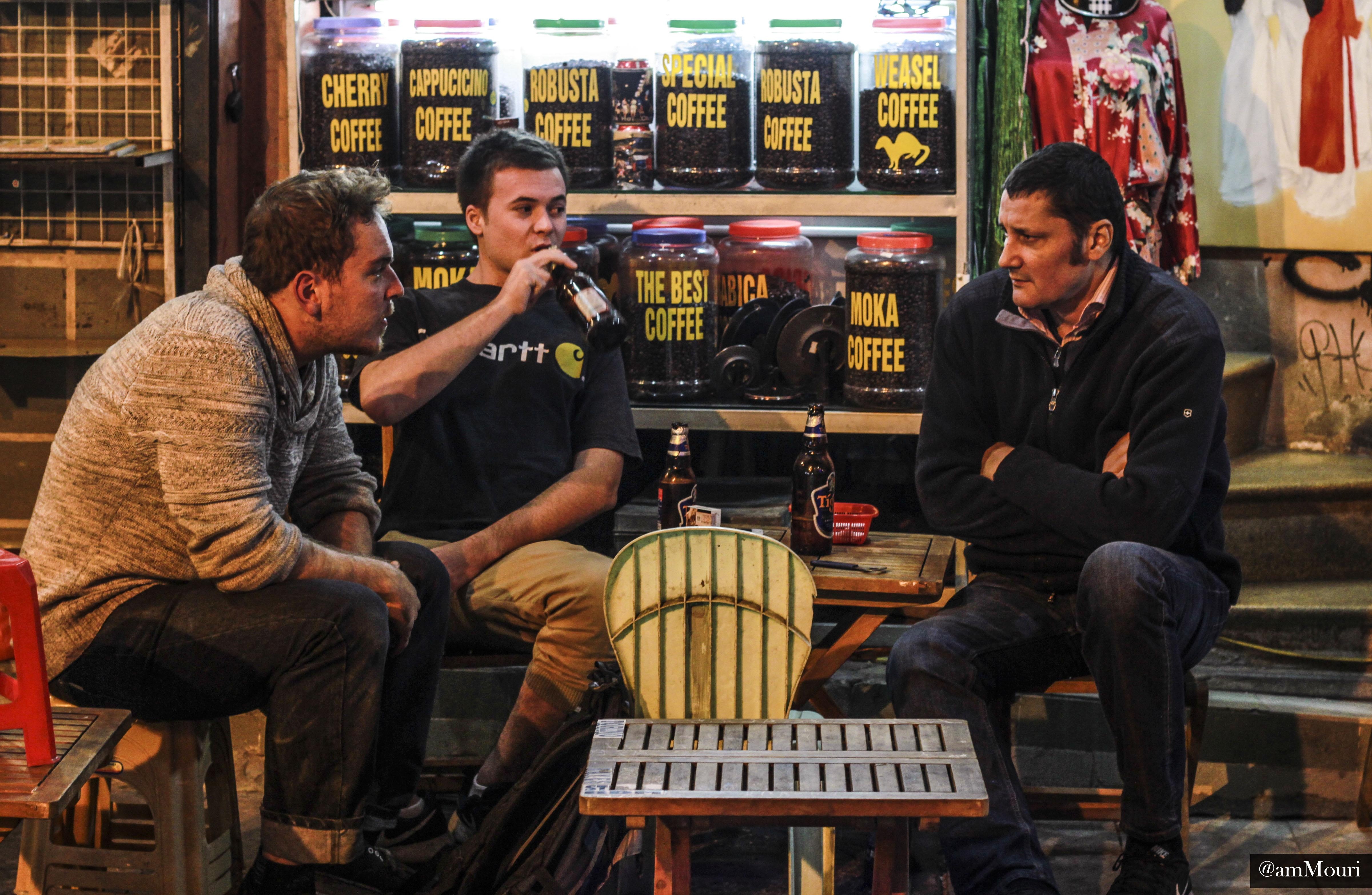 | Hai chàng trai khác lại uống bia chay ở một góc ngoài cửa khách sạn. |