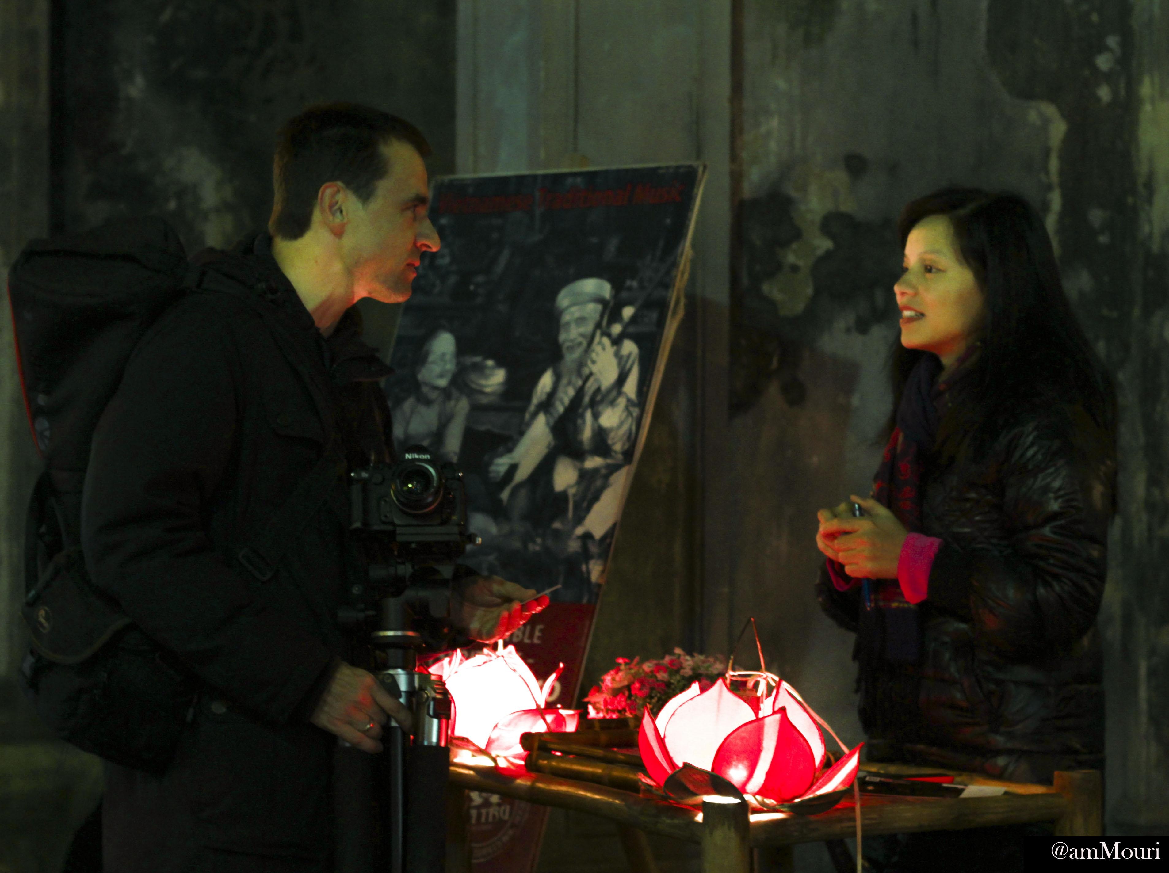 | Một du khách tìm hiểu về nghệ thuật ca trù trước cửa đền Quan Đế - nơi tổ chức biểu diễn ca trù vào các tối cuối tuần. |
