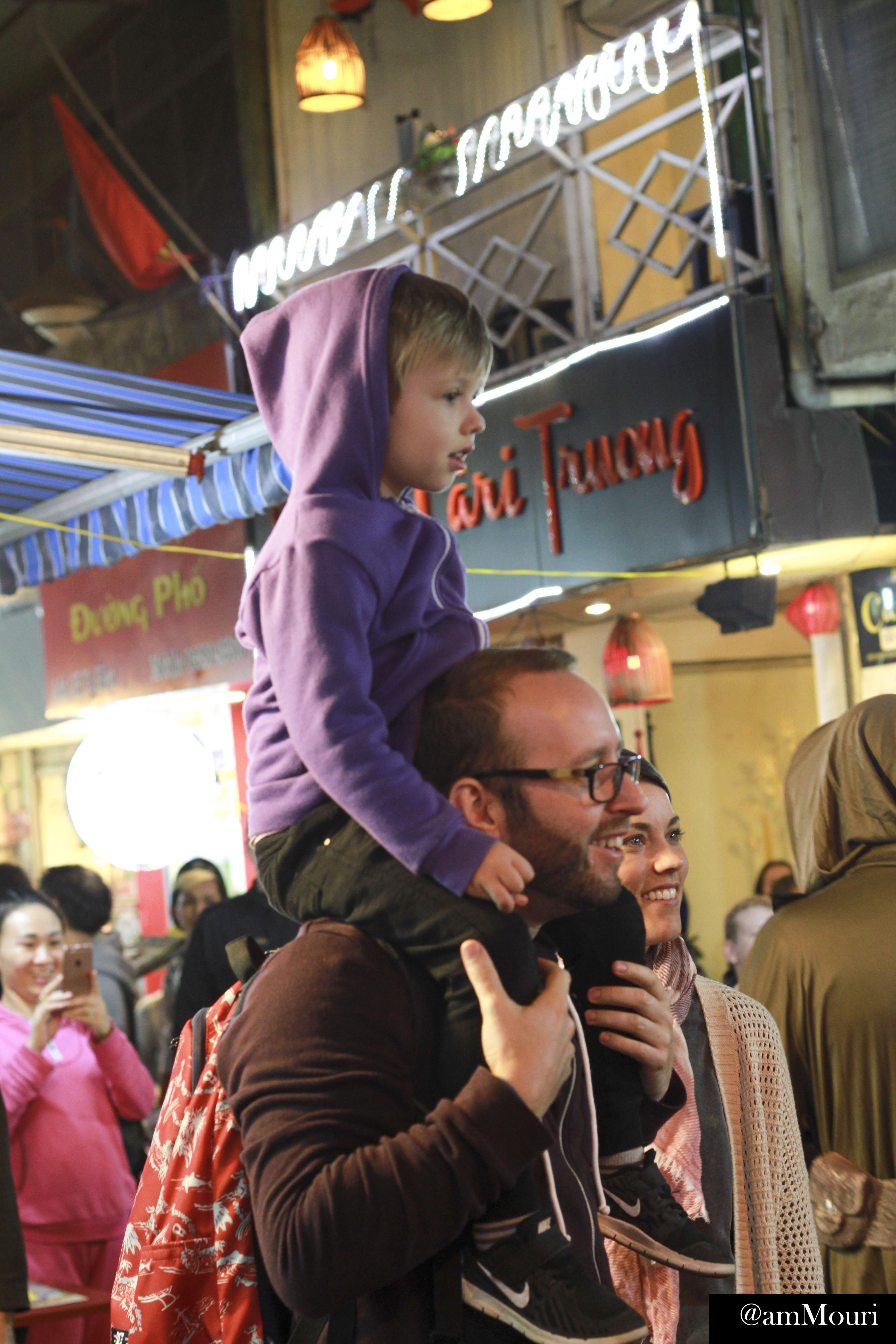 | Em bé được bố công kênh trên vai, ngắm những nhân vật bước ra từ trong bộ phim gắn với nhiều thế hệ khán giả. |