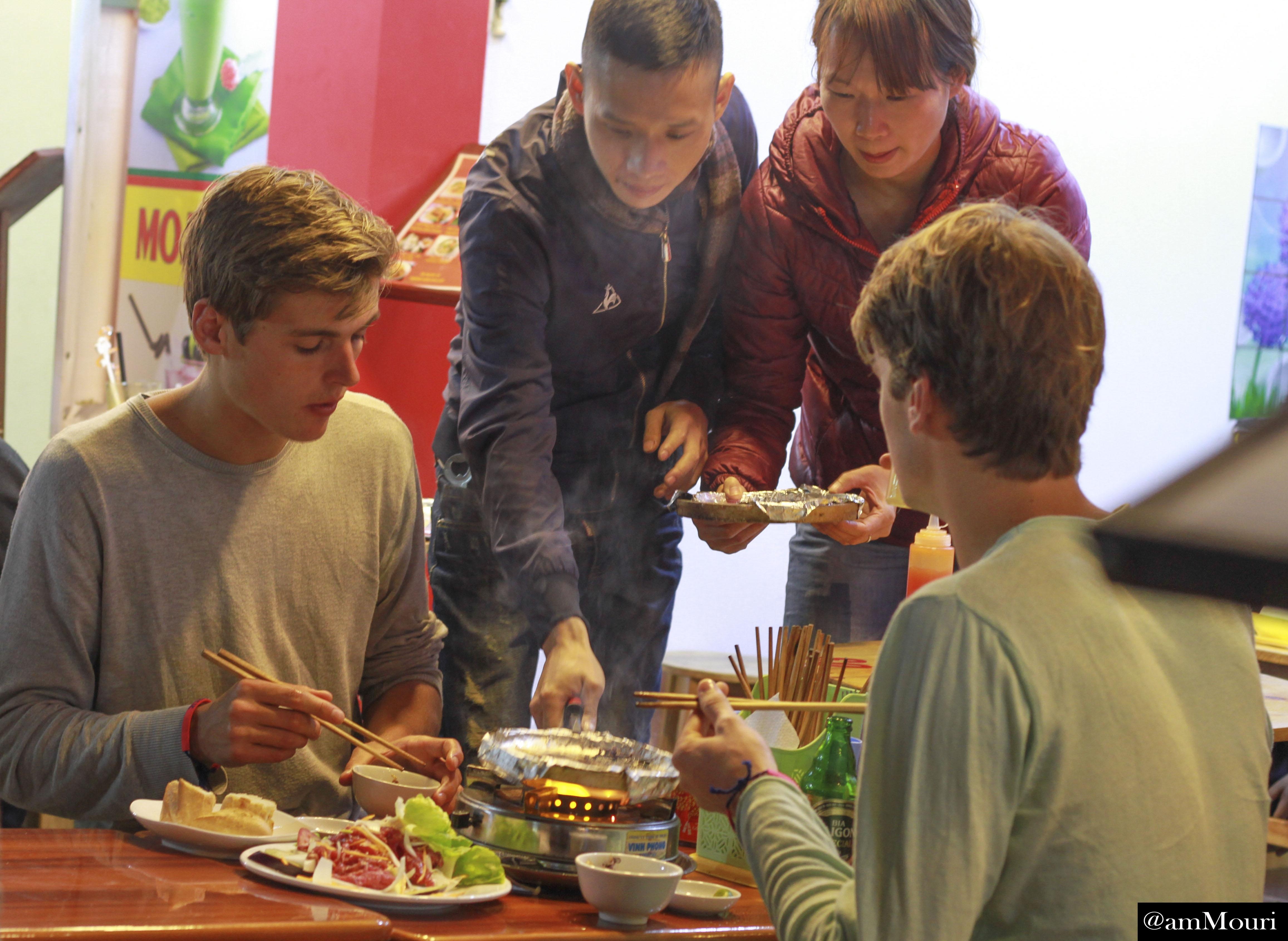 | Ở một quán ăn sang hơn, hai thực khách được nhân viên quán thịt nướng hướng dẫn và phục vụ tận tình. |