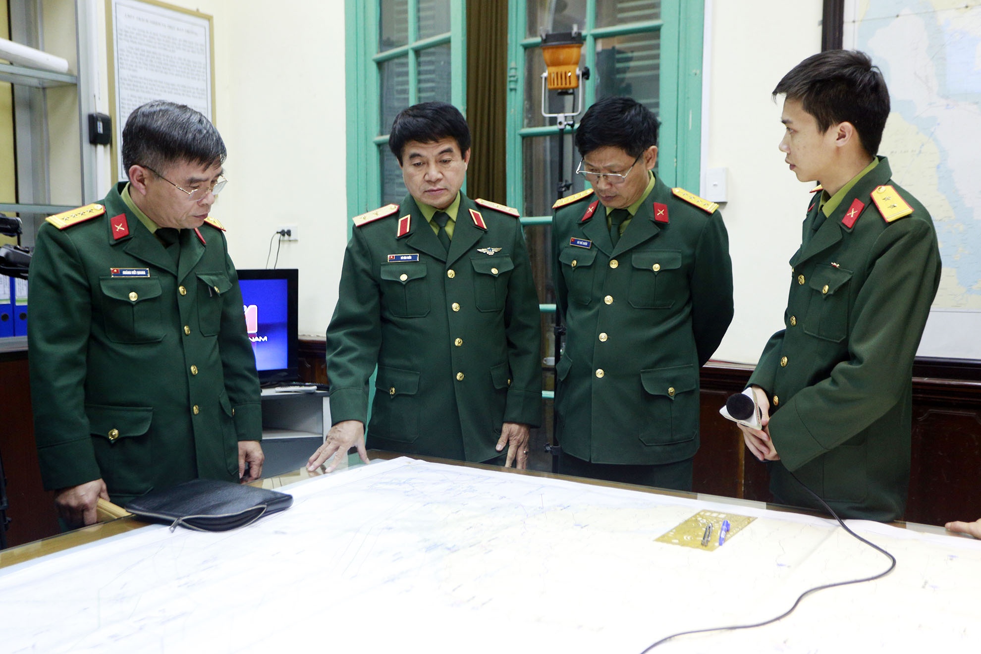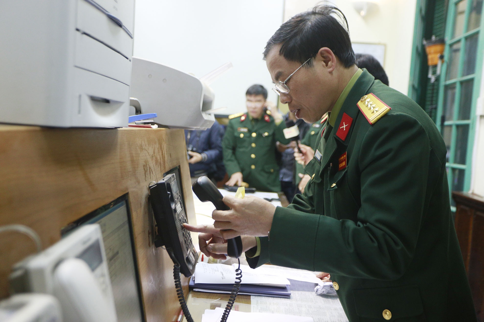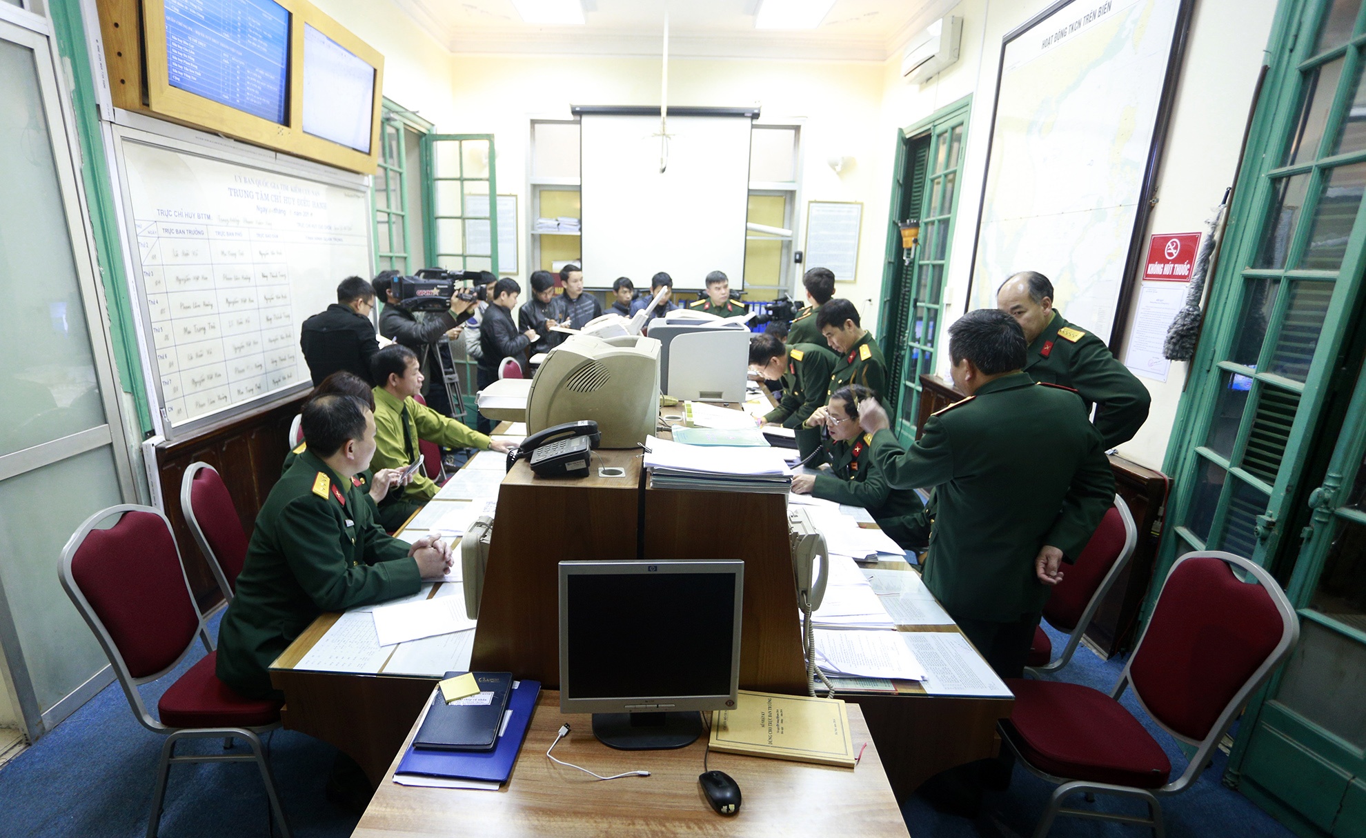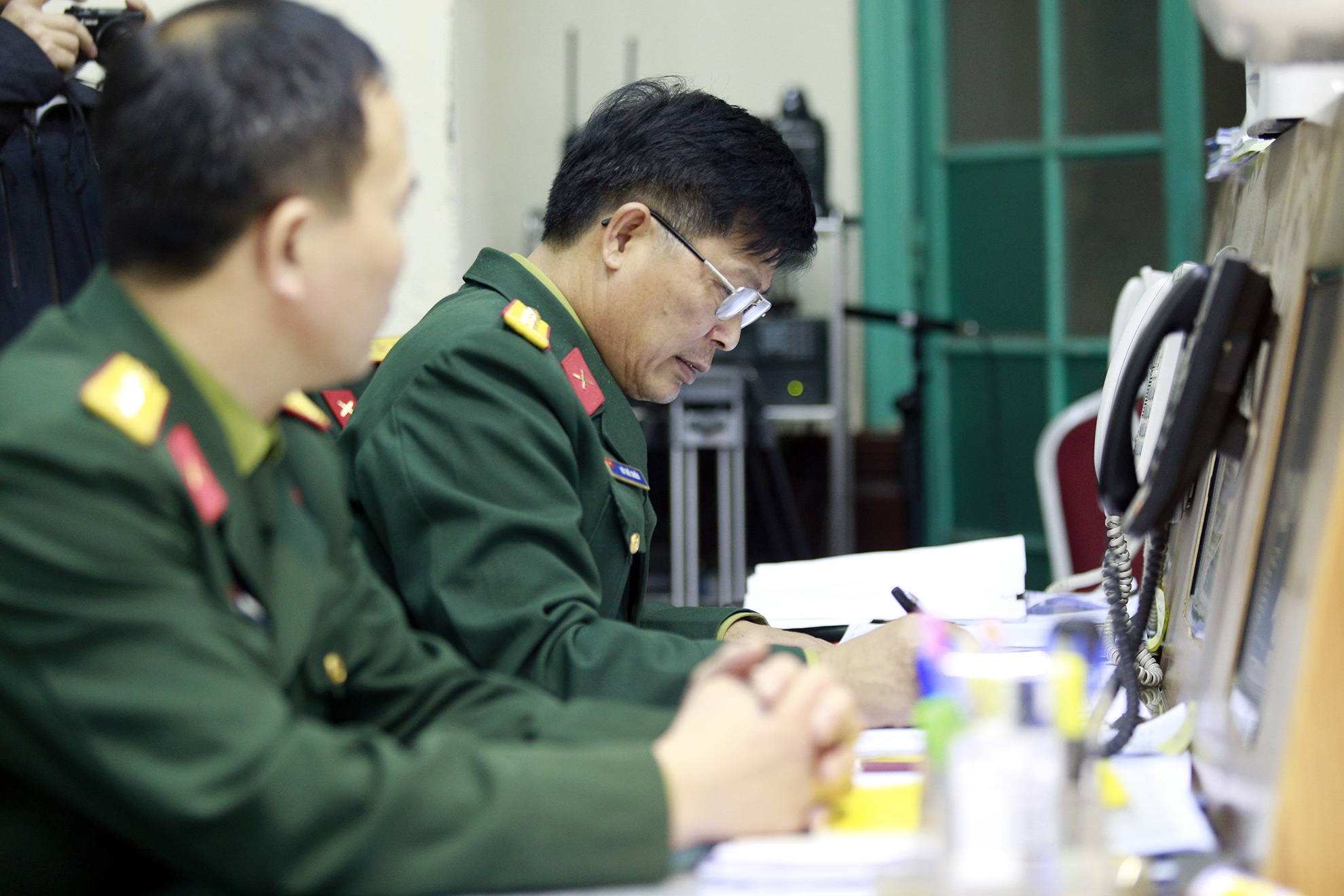 | Trung tướng Võ Văn Tuấn (thứ 2 từ trái qua) - Phó tổng Tham mưu trưởng Quân đội Nhân dân Việt Nam - có mặt tại trung tâm trong đêm để điều phối và trực tiếp chỉ đạo. |