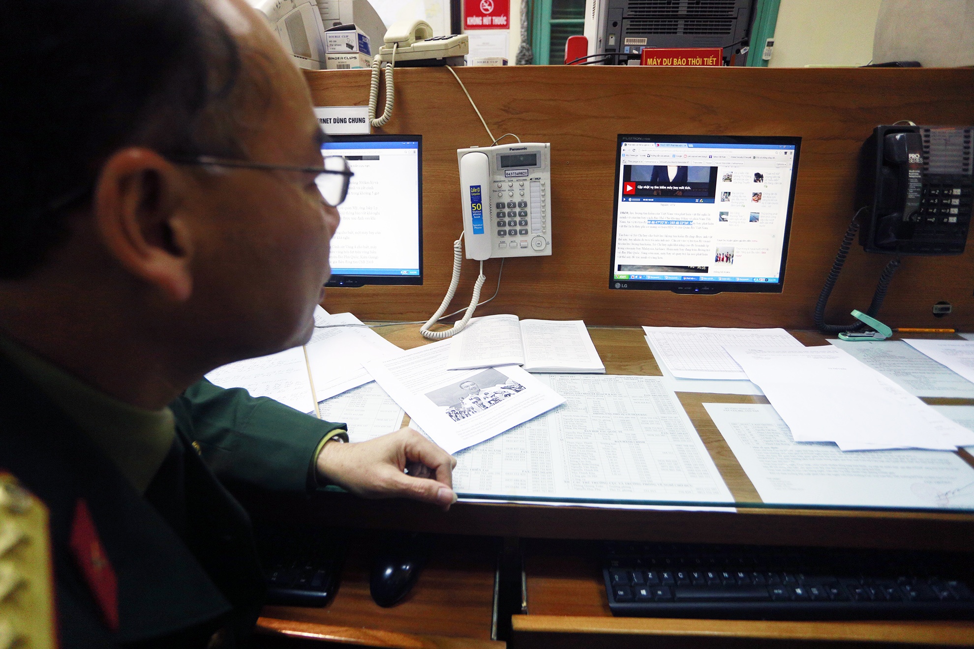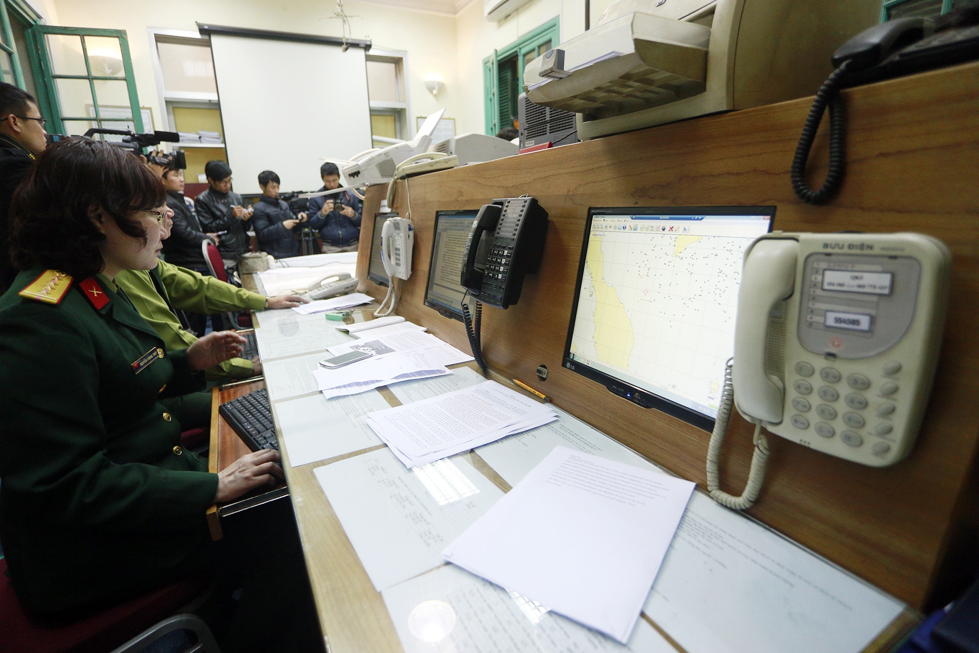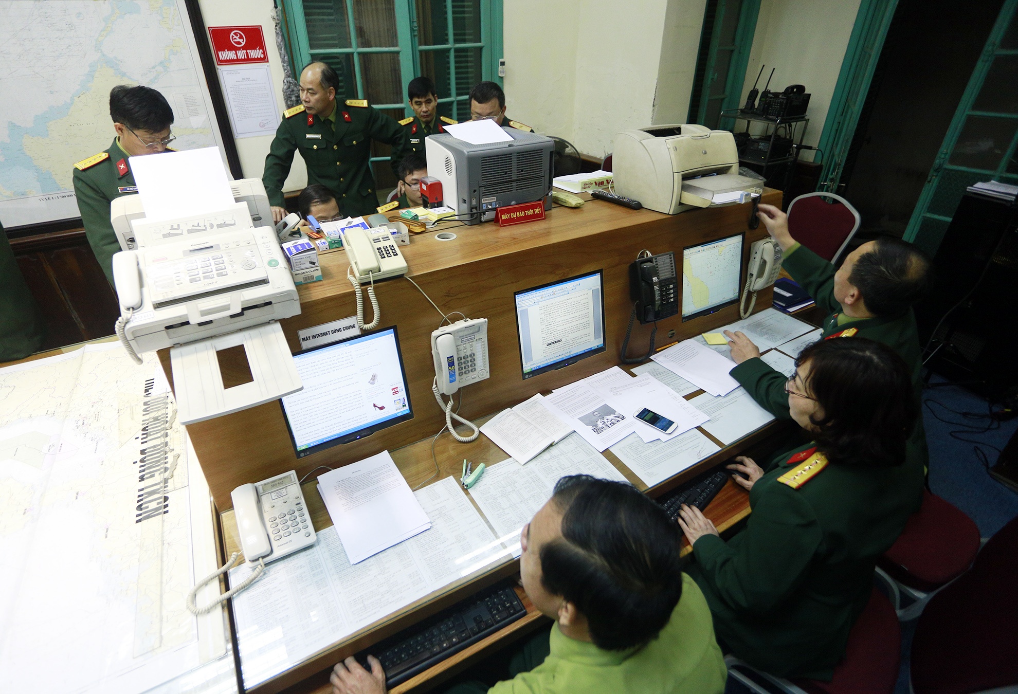 Cán bộ thuộc văn phòng chỉ huy tìm kiếm cứu nạn Quốc gia (26 Hoàng Diệu, Hà Nội) túc trực suốt ngày đêm để thu thập đầu mối từ thông tin tìm máy bay Boeing 777 mất tích.