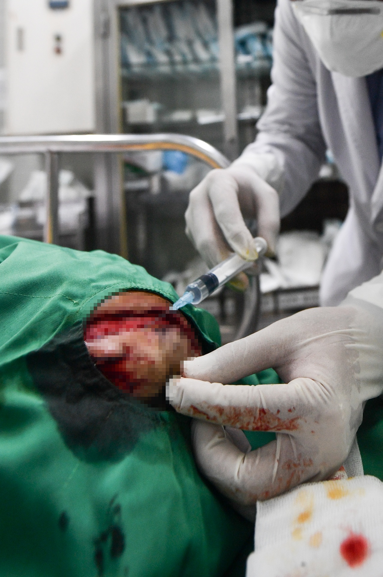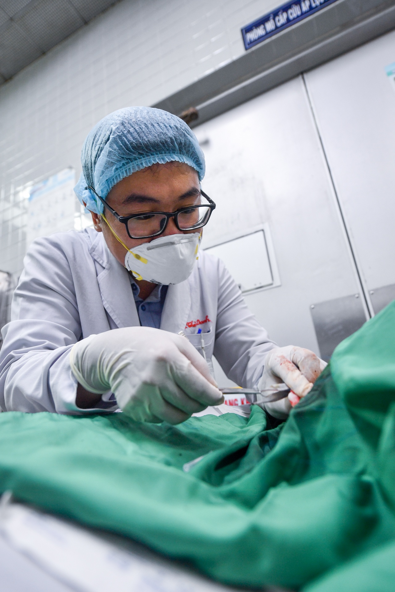 | Tuy vết rách khá dài và sâu, bệnh nhân vẫn tỉnh táo. Tôi vừa khâu vừa trò chuyện với bệnh nhân để ông thoải mái và bớt cảm giác đau. Tôi mất gần một giờ cho 25 mũi khâu để cố định lại vết rách. Tình trạng tạm ổn, tôi chuyển ông ấy lên phòng theo dõi. |