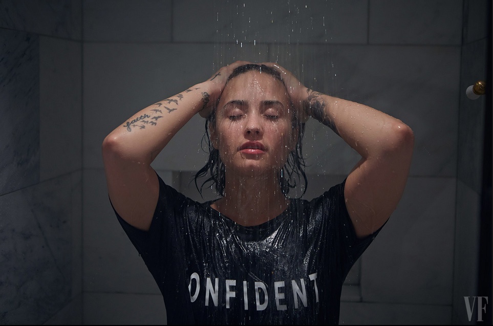 | Chiếc áo phông duy nhất Demi mặc trong bộ ảnh với dòng chữ Confident cũng là để ngầm quảng cáo cho album sắp ra mắt của cô. |