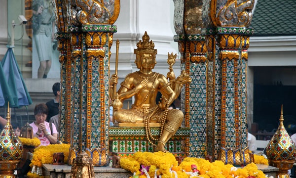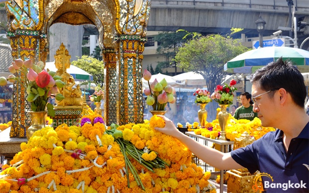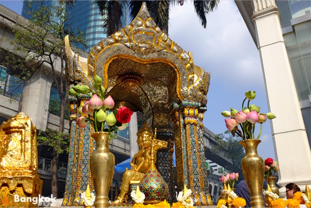 Hàng ngày, Erawan đón hàng nghìn du khách và người dân đến cầu nguyện. Ngôi đền có tượng vị thần Hindu 4 mặt - Than Tao Mahaprom - được đúc bằng vàng ròng, trang trí bằng đá quý. Tuy nhiều biến cố xảy ra gần công trình như biểu tình phản đối chính phủ năm ngoái hay vụ cháy trung tâm mua sắm Central World năm 2010, ngôi đền chưa bao giờ là mục tiêu tấn công. Ảnh: GoBangkok/Xinhua