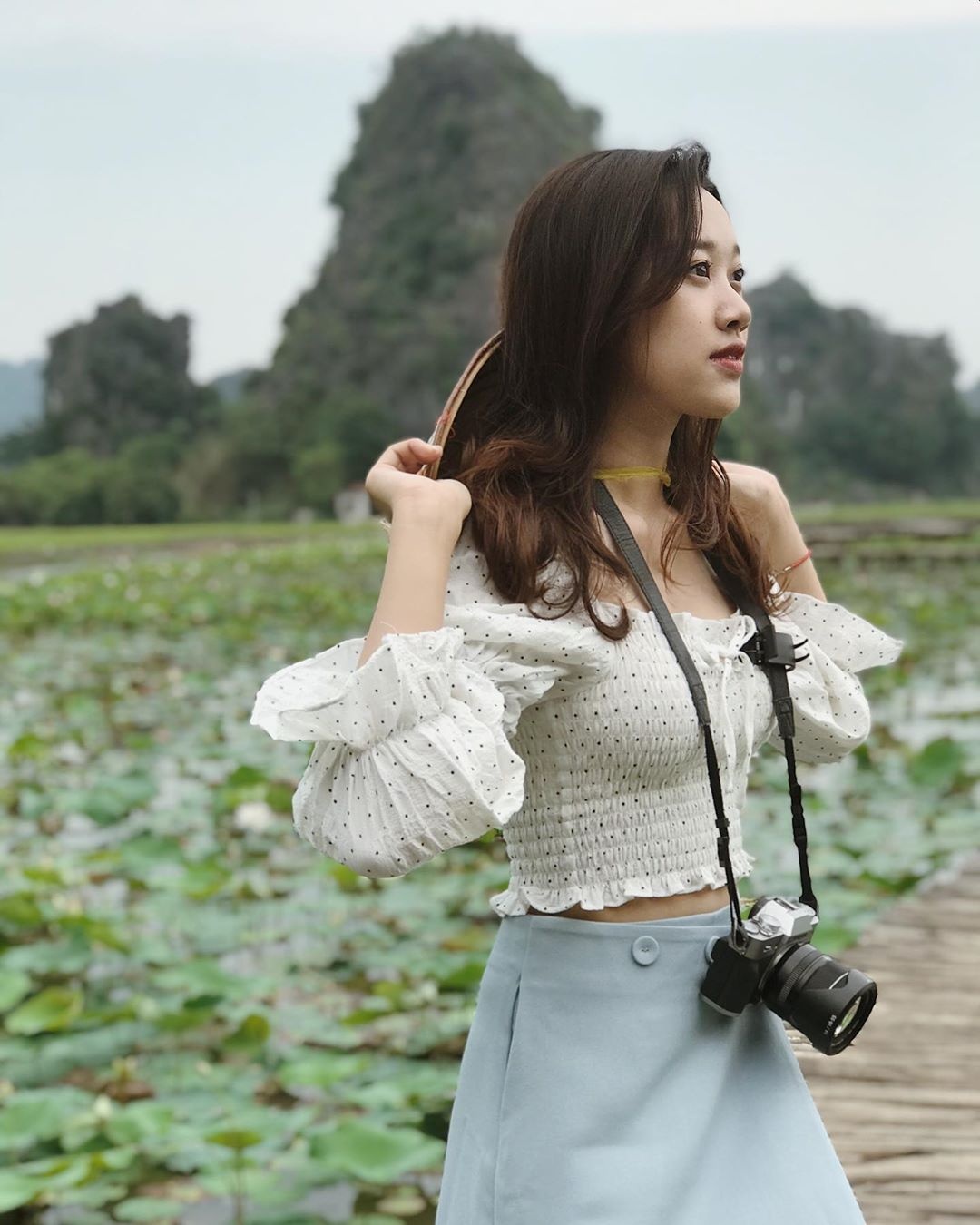 Khi đó nắng chưa gắt, hoa đương độ tươi và đẹp nhất, bạn có thể quan sát thấy sương sớm còn đọng trên lá hay cánh hoa. Bình minh cũng là khoảng thời gian để du khách có thể cảm nhận không gian thiên nhiên trong lành, mát mẻ nhất. Để bộ ảnh check-in thêm đặc sắc, nón là phụ kiến được nhiều người ưa chuộng để sống ảo giữa hồ sen. Ảnh: Panrosy, 1996cm__. |