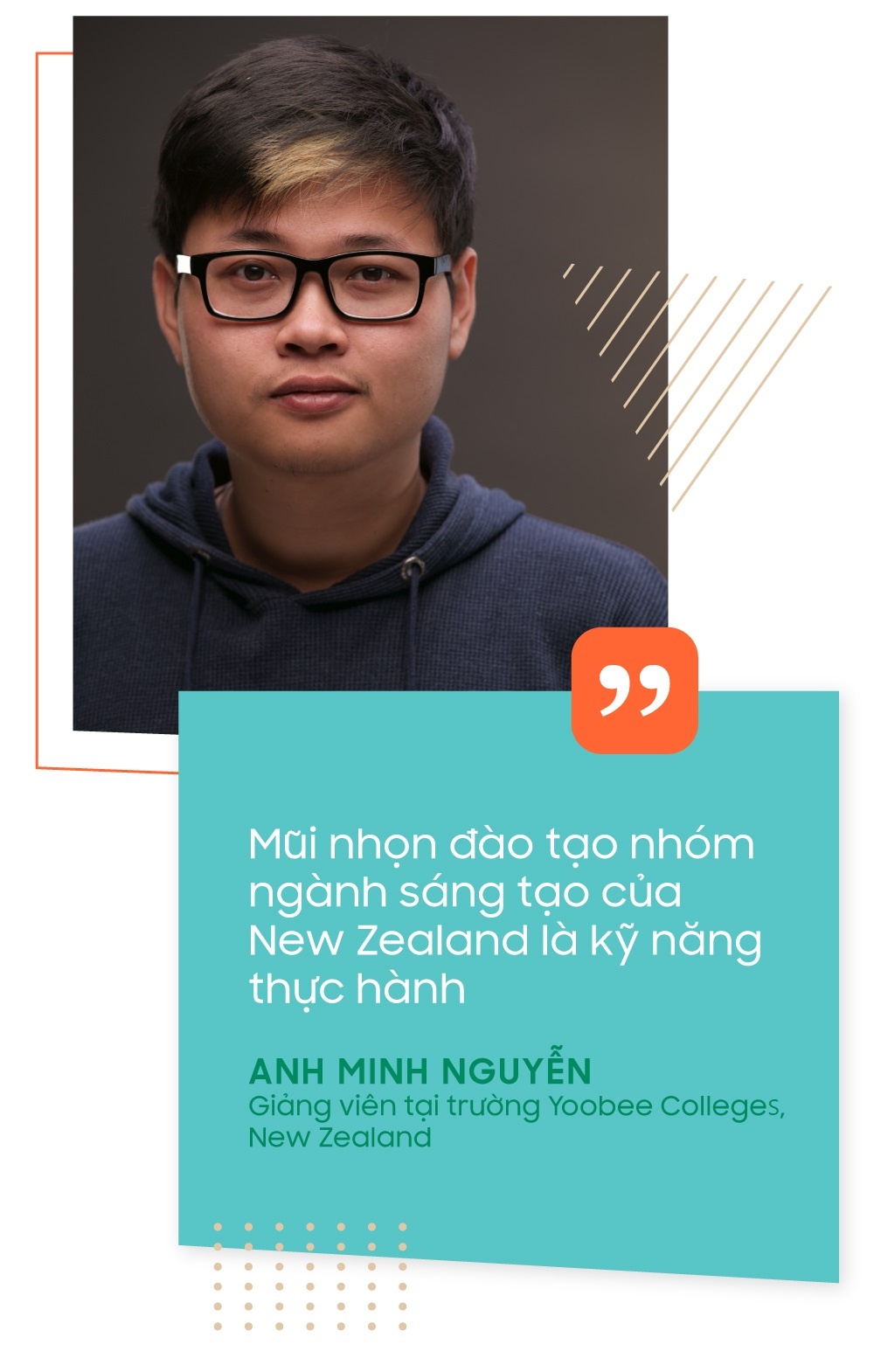 Dưới góc nhìn của một người trẻ từng du học và trở thành giảng viên tại xứ kiwi, anh Minh Nguyễn (giảng viên tại trường Yoobee College, New Zealand) cho biết mũi nhọn đào tạo nhóm ngành sáng tạo của quốc gia này là kỹ năng thực hành với môi trường học có tính thực tiễn cao.