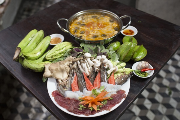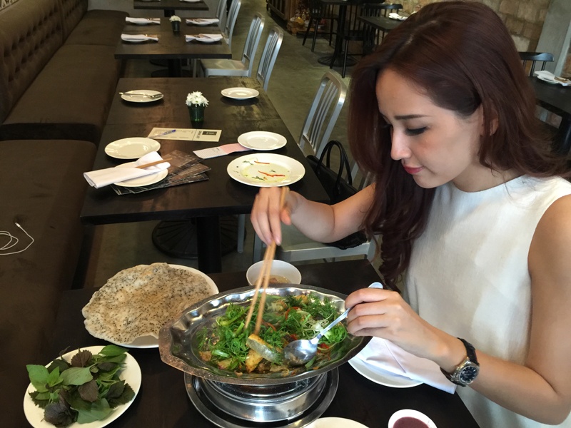 Hay nhúng, chấm món lẩu riêu cua bắp bò. Đây là những món ăn yêu thích của cô.