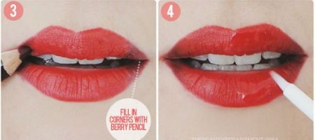 Đầu tiên, dùng chì kẻ 3/4 viền môi, không kẻ hai bên khoé môi như hình vẽ. Chú ý, nên chọn màu của chì kẻ môi tương tự với màu son đỏ của môi. Việc kẻ viền môi trước khi đánh son không chỉ giữ được màu son lâu hơn mà còn giúp đôi môi của bạn trong đầy đặn và căng mọng hơn. Sau đó, đánh kín son vào phần lòng môi như hình vẽ.