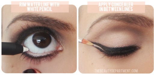 Sau khi dùng chì dạ tạo đường sắc nét cuối cùng cho mi dưới, dùng chì kẻ mắt trắng, vẽ đưỡng viền mi trong. Việc này sẽ giúp tôi mắt trông to, sáng và trẻ trung hơn. Tiếp đến sẽ là bước chia đôi đuôi mắt mèo, dùng một cây cọ mềm lấy một lượng kem nền cùng với màu da bạn của bạn...
