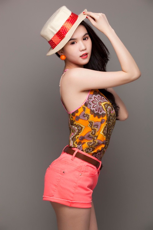 Ngọc Trinh lựa chọn phong cách trẻ trung với tông màu rực rỡ của short và áo 2 dây. |