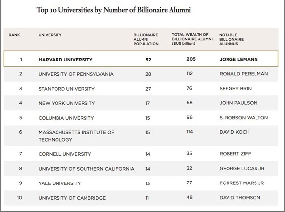 Theo số liệu từ công ty Wealth-X và ngân hàng UBS (Thụy Sỹ), đại học Harvard với 52 tỷ phú là cựu sinh viên, sở hữu tổng tài sản trị giá 205 tỷ USD đứng vị trí số một bảng xếp hạng. Vị trí thứ 2 là trường đại học Pennsylvania với 28 tỷ phú tốt nghiệp. Cũng trong top 10 trường sở hữu sinh viên siêu giàu 2013, thì các trường đại học Mỹ đã thống trị danh sách với 9 trường.