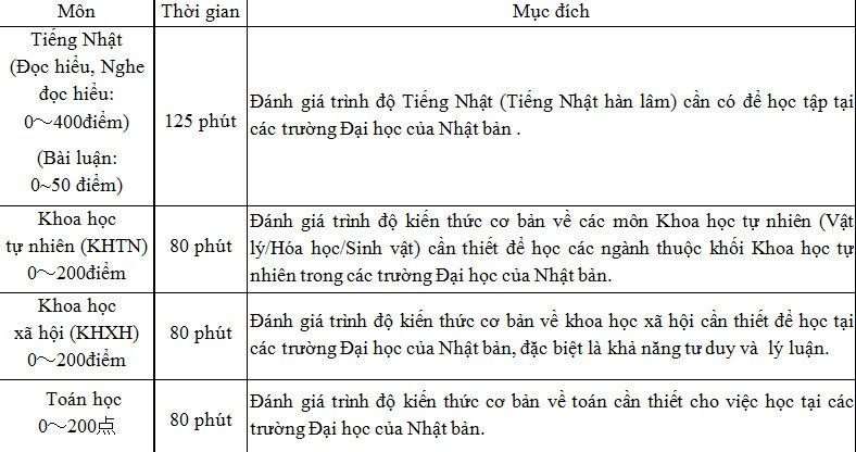 Ngôn ngữ được sử dụng trong kỳ thi:tiếng Nhật hoặc tiếng Anh. (Môn tiếng Nhật chỉ ra đề bằng tiếng Nhật). Tuy nhiên, đề thi bằng tiếng Nhật và bằng tiếng Anh được in ở 2 tập khác khau cho nên khi nộp đơn dự thi, thí sinh phải lựa chọn ngôn ngữ thi theo yêu cầu của trường đại học mà mình có nguyện vọng dự thi.