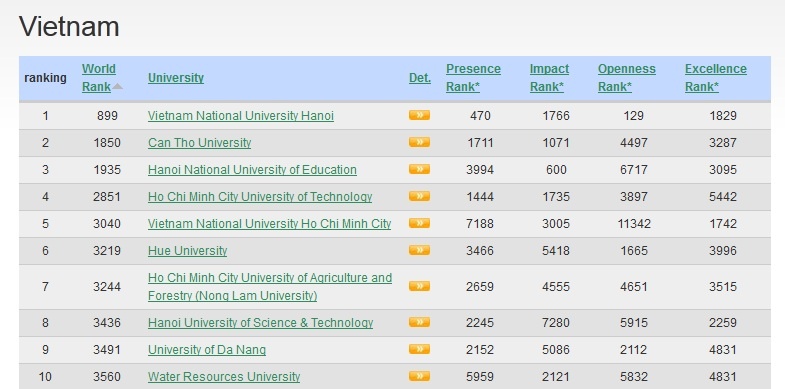 Theo bảng xếp hạng này, Việt Nam có gần 120 trường được đánh giá, trong đó ĐH Quốc gia Hà Nội đang chiếm vị trí hàng đầu Việt Nam, xếp thứ 899 trên thế giới, 207 Châu Á và 23 Đông Nam Á. Trong nhiều năm gần đây, ĐH Quốc gia luôn giữ vững vị trí dẫn đầu này.