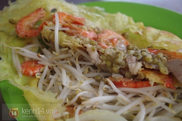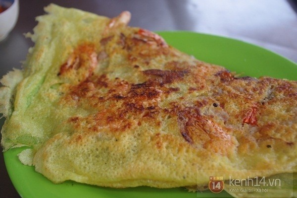 Bánh của quán phải nói là rất ngon. Bánh xèo được chiên nóng giòn với nhiều nhân là thịt và tôm sú nhỏ (theo người bán thì tôm sú sẽ giòn, ngọt thịt và khi chín sẽ lên màu đẹp hơn các loại tôm khác). Một cái bánh xèo như trong hình có giá 27k được ăn kèm với rất nhiều loại rau và có cho kèm cả bánh tráng (mấy thứ này ăn vô tư, hết gọi thêm thoải mái).