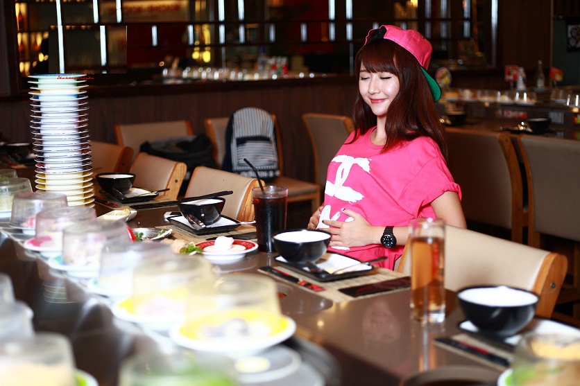 | Quỳnh Anh và chồng đĩa cao ngất. |