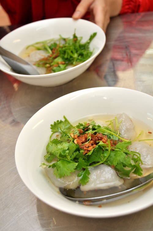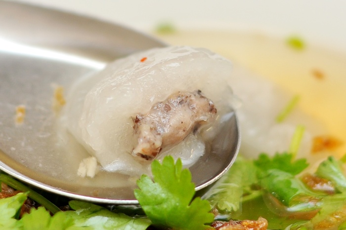 Ngoài nem lụi “xinh xinh”, quán còn có món bột lọc cũng “bé hạt tiêu” nên đặt tên là bột lọc tiêu. Hương vị món ăn cách điệu với vỏ bánh dẻo dai, nhân thịt cua xay thơm mà lạ miệng hẳn. Bột lọc tiêu luôn vừa hấp nóng hổi được chan ngập nước mắm có phủ hành phi do quán tự làm thơm phức. Bánh lại nhỏ, lọt thỏm trong chiếc thìa cơm, khách xúc ăn càng dễ mà xì xụp thêm được nước mắm chua ngọt pha khá chuẩn của quán. Bột lọc tiêu bán theo bát 20.000 đồng/8cái – không hề rẻ nhưng ngon, đáng để bạn ăn thử.