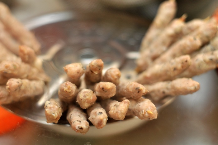 Nem ở đây không lụi vào đũa to hay củ sả, chủ quán dùng xiên que nhỏ xíu khiến khách thoạt nhìn sẽ thấy so với giá, chiếc nem có phần đắt đỏ. Nhưng thực chất, nem phết vào xiên nhỏ mới đặc ruột, lúc thưởng thức cũng vừa miếng, vừa tay.
