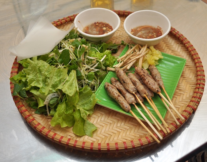 Nhưng ăn như vậy “tốn mồi”. Bạn đừng quên bánh đa, rau sống, đồ ghém để cuốn cùng mới đúng điệu và lai rai được. Nem lụi của quán có giá 6.000 đồng/chiếc và luôn được sắp trong mẹt tre trông sạch sẽ, bắt mắt.