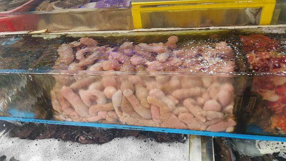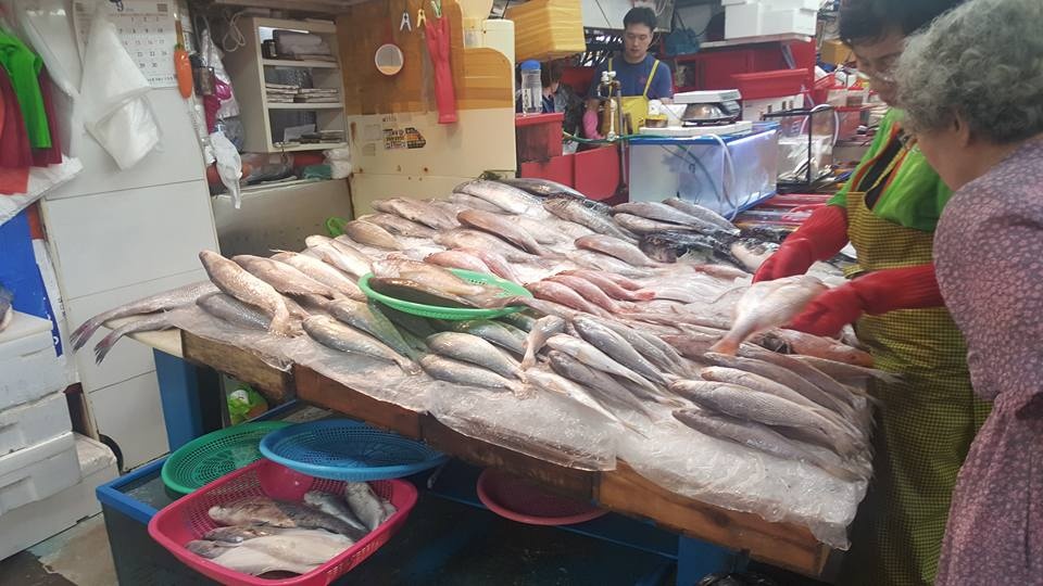 Chợ bán nhiều loại cá và hải sản tươi sống được bán trong chợ như cua, ghẹ, tôm hùm, nhím biển, sứa, mực, bạch tuộc cùng các loại cá đuối, cá trích... |