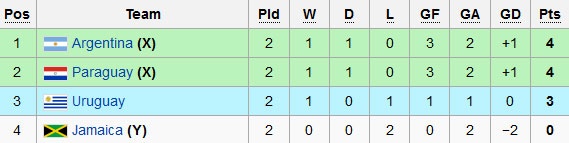 Sau 2 trận, Argentina và Paraquay chiếm hai vị trí đầu bảng B khi cùng được 4 điểm và có hiệu số +1. Ở lượt cuối vòng bảng, đoàn quân do HLV Martino dẫn dắt gặp đối thủ yếu nhất bảng Jamaica ngày 20/6. Khả năng vào tứ kết của ĐT Argentina là rất cao.