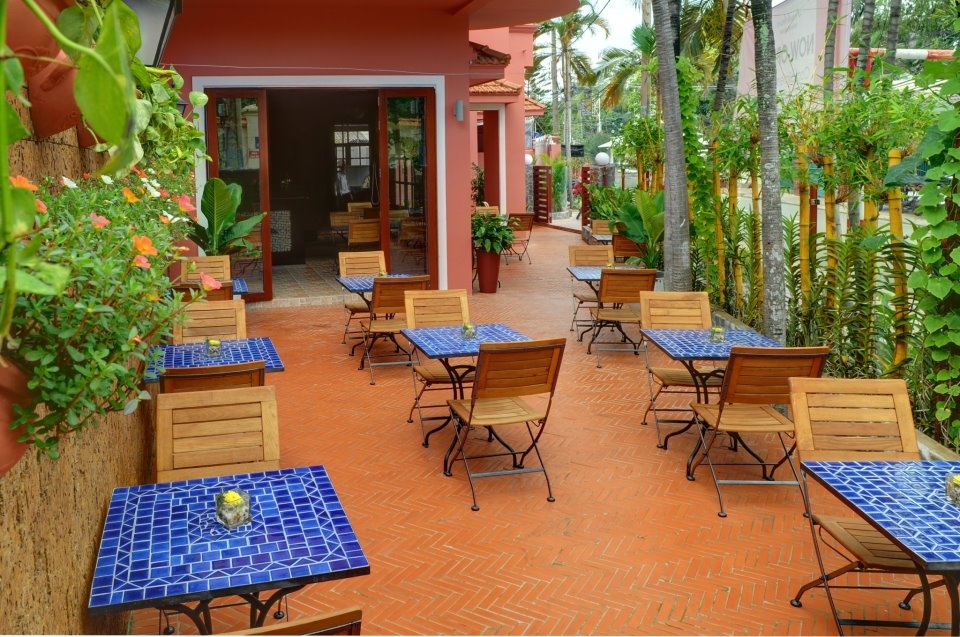 Với không gian ngập tràn sắc xanh, những ngày thời tiết oi bức như thế này, bạn vẫn có thể thoải mái tận hưởng bữa trưa của mình bởi cái nắng chói chang đã được che bớt bởi giàn hoa màu tím nhạt thả trên đầu. Đặc biệt, dãy bàn vuông vắn ngoài vườn chỉ được kê 2 chiếc ghế mỗi bàn với khoảng cách tiêu chuẩn dường như được thiết kế dành riêng cho những cuộc hẹn hò hoặc trò chuyện thân mật.