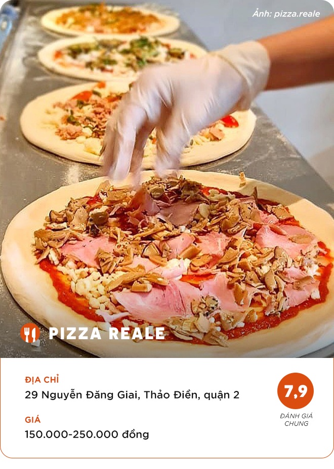 Đầu bếp Italy Manuel Reale đặt nhiều tâm huyết và tình yêu vào cửa hàng pizza này. Pizza Reala phục vụ gần 30 loại pizza khác nhau với mức giá từ 120.000 đến 290.000 đồng. Ngoài pizza, thực đơn tại đây cũng có nhiều món đa dạng từ các loại salad, phô mai, mì và các món nướng, đút lò.