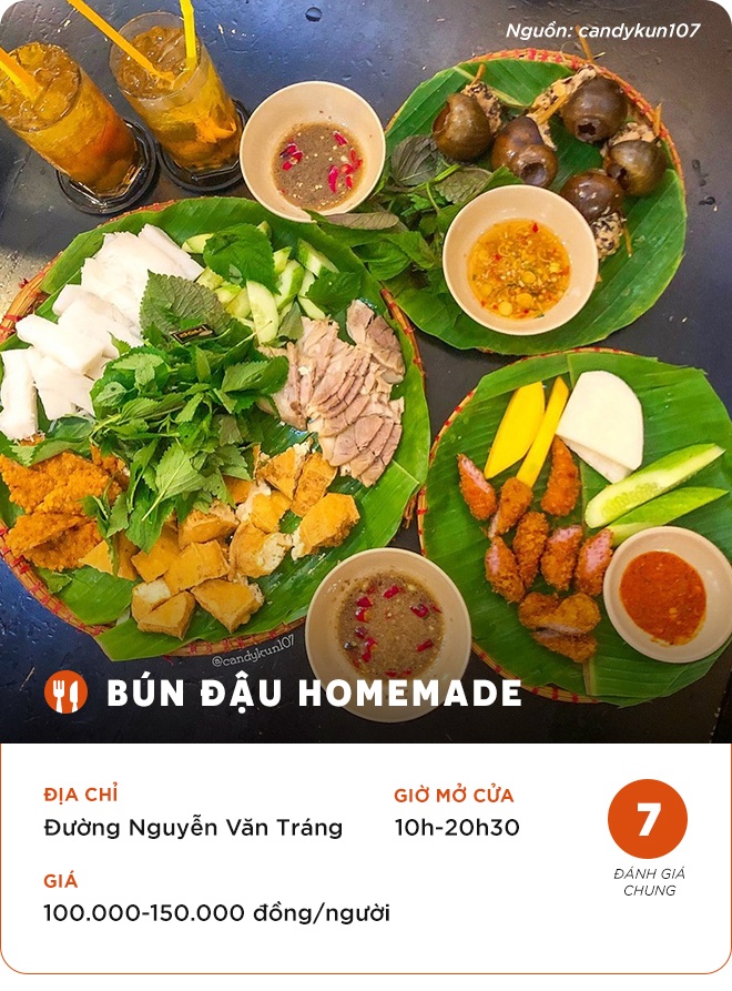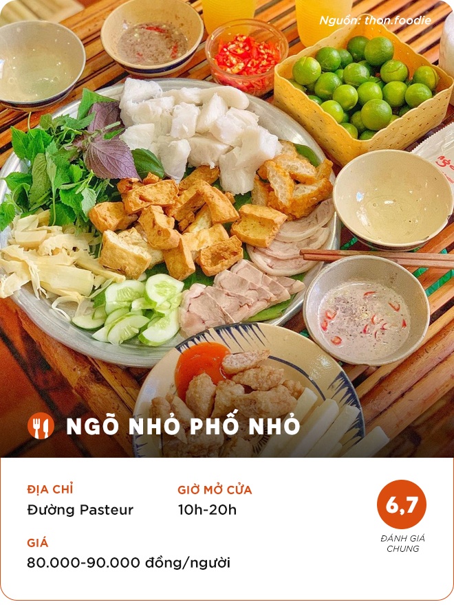 Thủy Trần: "Bún đậu Ngõ Nhỏ Phố Nhỏ nằm trên đường Pasteur, bên ngoài có cổng sắt màu xanh, bảng hiệu nhỏ nên bạn phải chịu khó để ý mới thấy được. Tụi mình chọn combo 1 gồm bún đậu tá lả, nem chua rán và ly trà chanh. Nem chua rán ăn lạ miệng, phần bún đậu cũng nhiều, trà ngon".