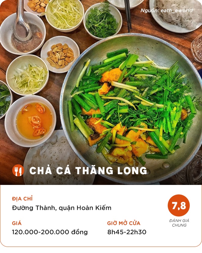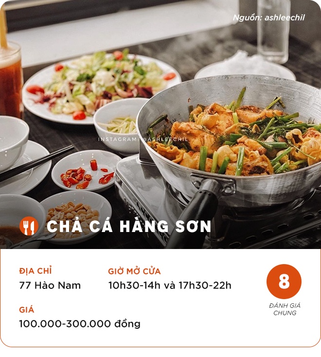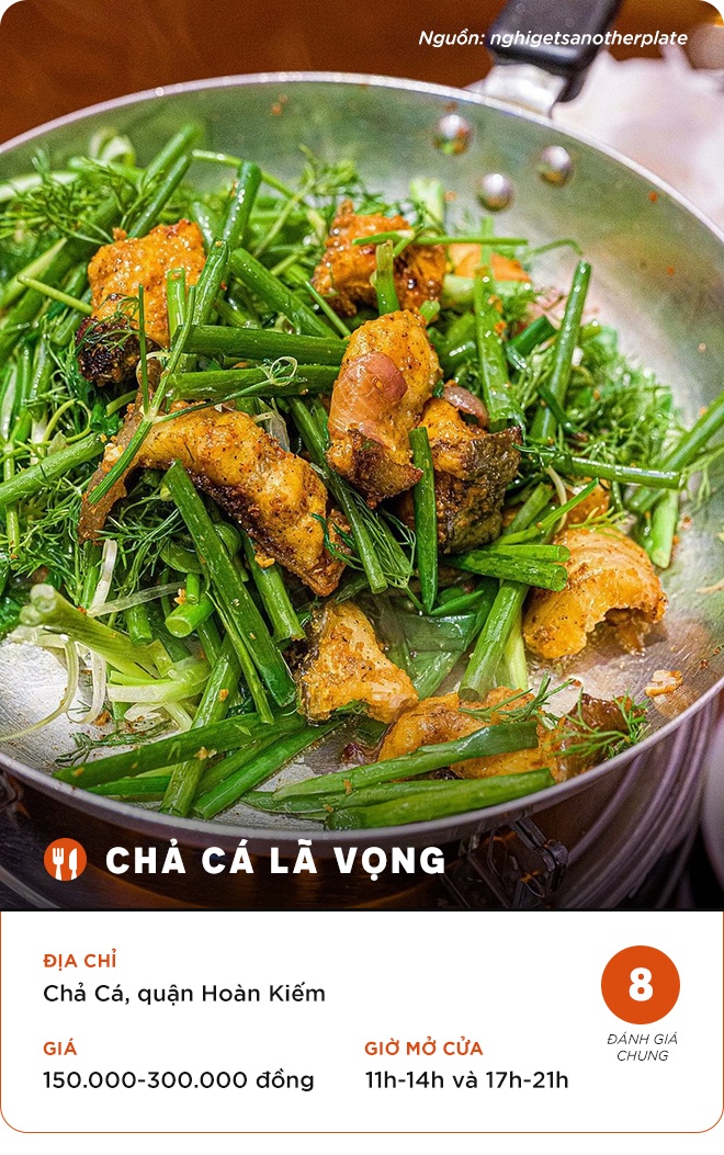 Đây là địa chỉ phục vụ món chả cá lâu đời ở Hà Nội. Quán có tuổi đời khoảng 130 năm. Món chả cá được làm từ cá lăng tươi. Cá được thái mỏng và tẩm ướp các loại gia vị như mẻ, nghệ, riềng, hạt tiêu và nước mắm theo công thức gia truyền. Các sau khi ướp được kẹp vỉ nướng trên bếp than.