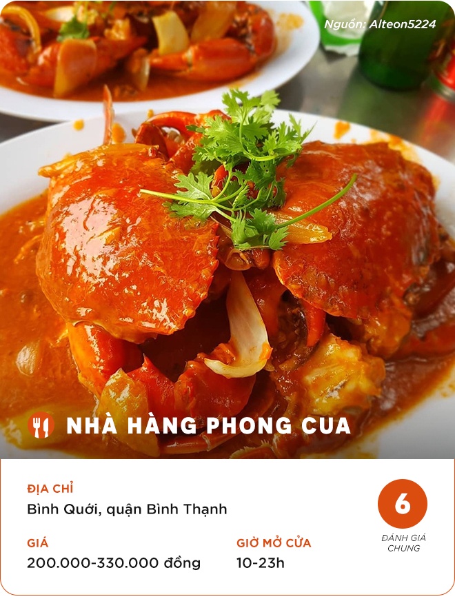 Cua là một trong những lựa chọn ưa chuộng của giới sành ăn. Bạn có thể thưởng thức nhiều món khác nhau từ nguyên liệu này như sốt, rang me, hấp, nem, bánh canh... Các địa chỉ dưới đây nổi tiếng bậc nhất TP.HCM, được nhiều thực khách đánh giá cao về chất lượng món ăn.