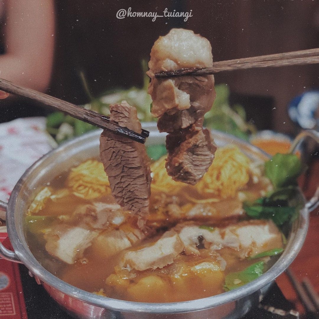 Minh Nhi: "Tình cờ biết được quán này nên mình ghé thử. Ở đây bán theo đầu người, tới quán tìm bàn rồi gọi chú. Quán lề đường, bán ngay đầu hẻm nên chỗ ngồi không được thoải mái. Thái độ phục vụ không như kỳ vọng, cô chủ niềm nở còn mặt chú hơi căng, nhưng mà gọi gì là có liền. Mình đi 2 người, gọi nồi lẩu, thêm rau, trà đá, khăn mà tổng chỉ tầm 165.000 đồng. Lẩu ở đây có thịt bò nạm, gân bò cắt nhỏ nấu kiểu bò kho và nấm kim châm".