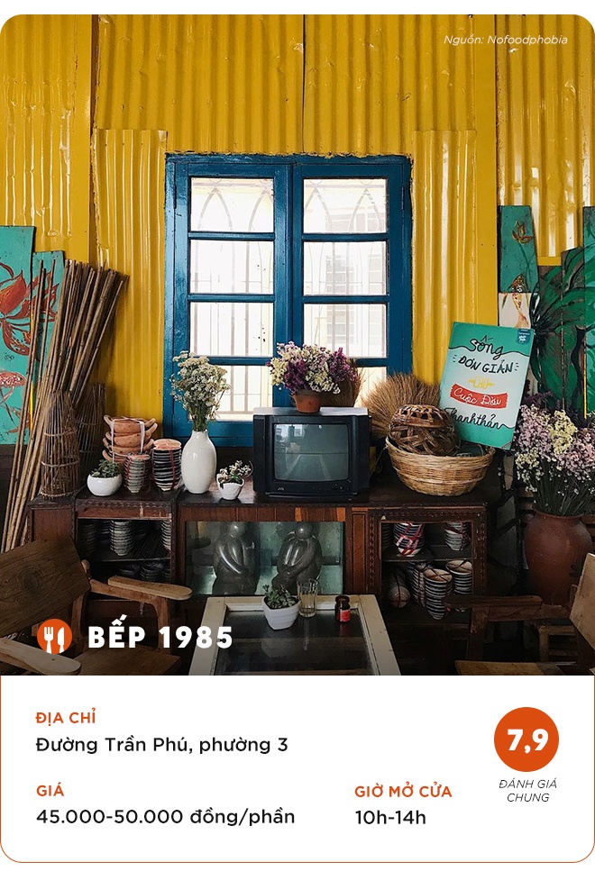 Bếp 1985 là nơi nhiều du khách ghé Đà Lạt chọn để cùng ăn bữa cơm gia đình đầm ấm. Đến đây, bạn sẽ được thưởng thức những món ăn mang đậm hương vị Việt như cá kho, thịt kho mắm ruốc, rau luộc, cà pháo, canh chua, trứng chiên... bài trí trên mâm cơm tròn trịa như bữa cơm nhà mẹ nấu.