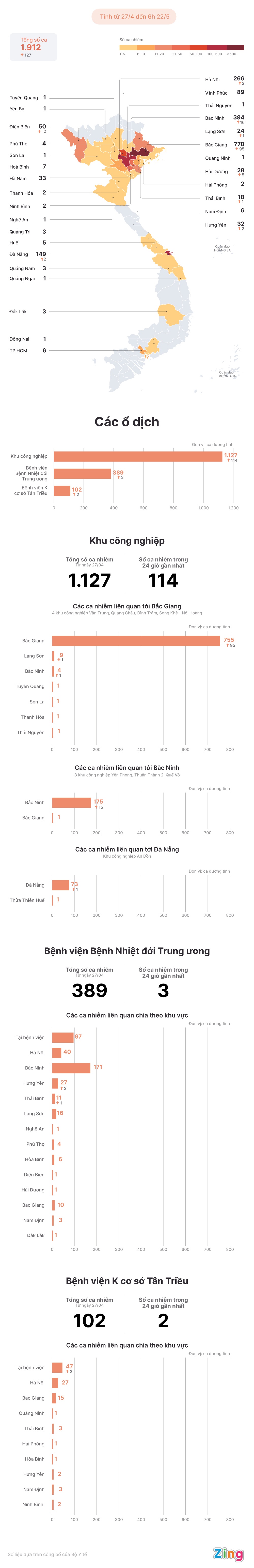 Từ 27/4 đến nay, Việt Nam phát hiện tổng cộng 1.912 người mắc Covid-19 tại 30 tỉnh, thành phố. Trong đó, phần lớn ca bệnh liên quan ổ dịch ở các khu công nghiệp.