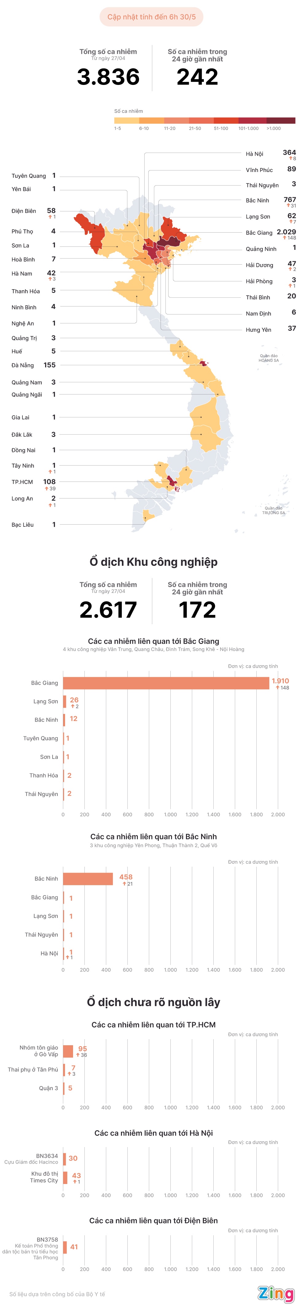 Từ 27/4 đến nay, Việt Nam ghi nhận 3.836 ca mắc Covid-19 tại 34 tỉnh, thành phố. Trong đó, nhiều ổ dịch vẫn chưa rõ nguồn lây.