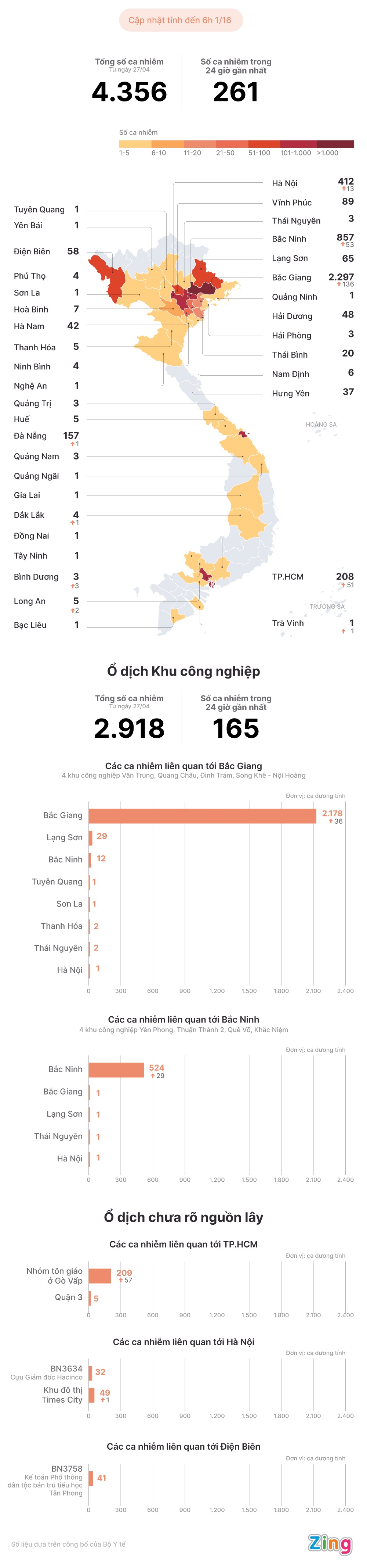 Kể từ ngày 27/4, Việt Nam đã ghi nhận 4.356 bệnh nhân mắc Covid-19. Đặc biệt, Bắc Giang vẫn là địa phương ghi nhận số người nhiễm nCoV cao nhất cả nước.