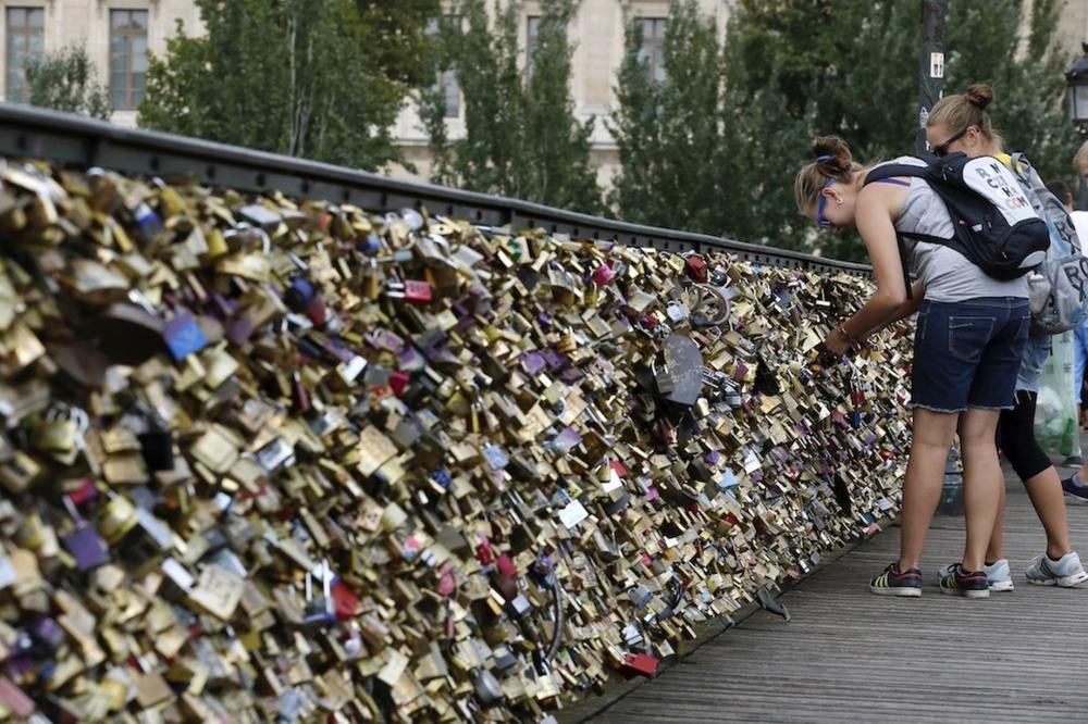 | Hằng năm, hàng ngàn hàng vạn đôi tình nhân tới chơi Paris đã đeo "khóa tim trong tim" trên cây cầu tình yêu nổi tiếng nơi đây. |