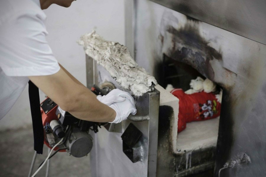 | Một nhân viên của công ty chuẩn bị thiêu con vật. |