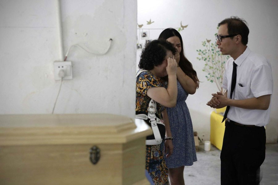 | Zhou Jin Xia, chủ sở hữu công ty dịch vụ mai tang thú cưng, cố gắng an ủi những người chủ của chú chó hôm 29/8. |