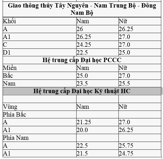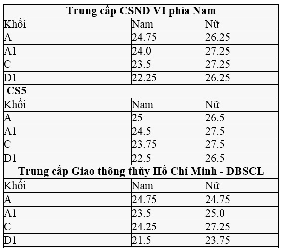 Điểm chuẩn cao thuộc các trường trung cấp Cảnh sát nhân dân I, Cảnh sát nhân dân II, Cảnh sát nhân dân III, trung cấp An ninh nhân dân I, An ninh nhân dân II.