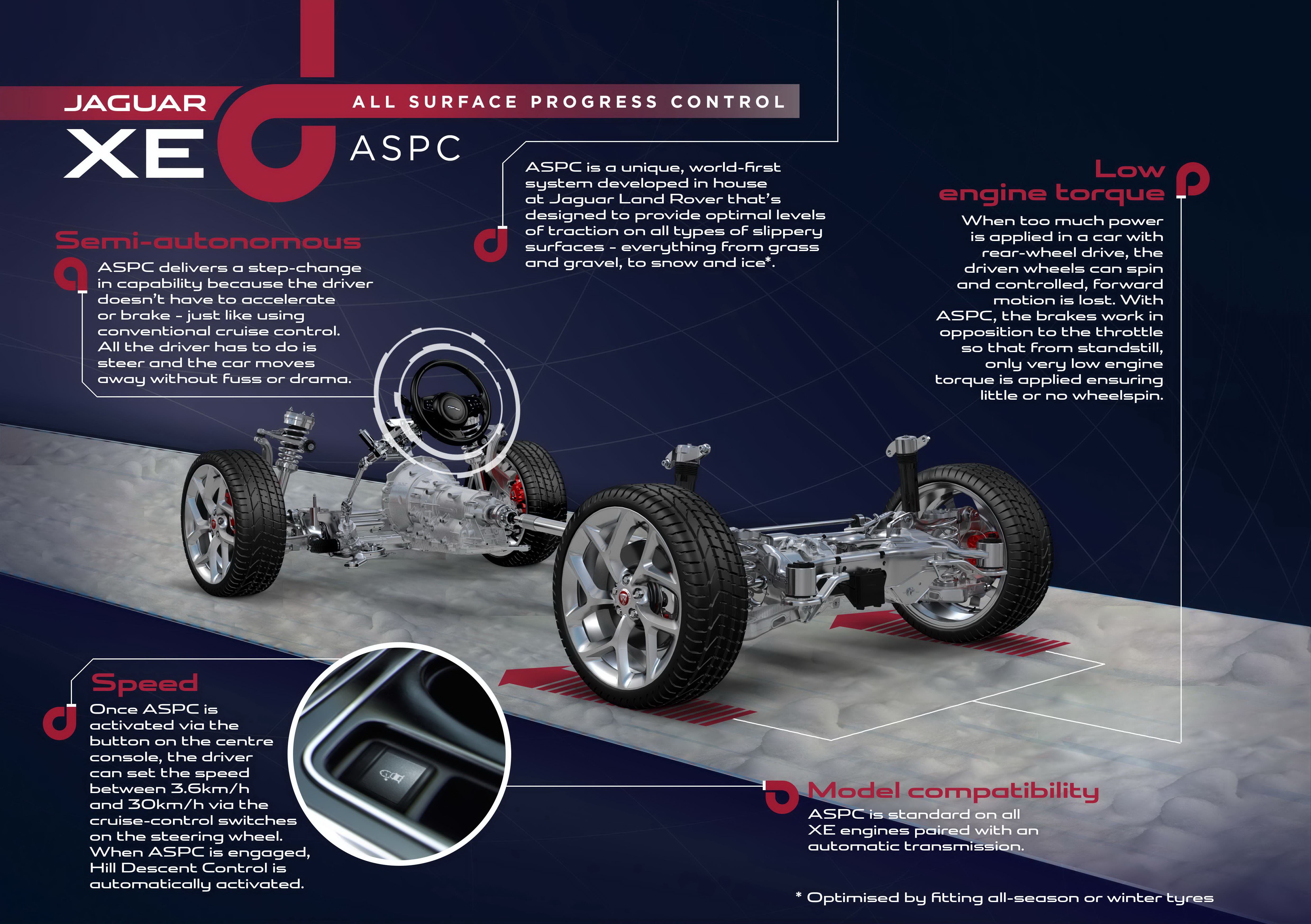 Đầu tiên là hệ thống kiểm soát độ bám đường. Jaguar phát triển chức năng độc đáo được gọi là ASPC - kiểm soát hành trình trên mọi bề mặt (All Surface Progress Control) nhằm thích ứng với những bề mặt đường trơn trượt khác nhau. Ngoài ra, ASPC cũng cho phép người lái cài đặt tốc độ cố định dưới 30 km/h.