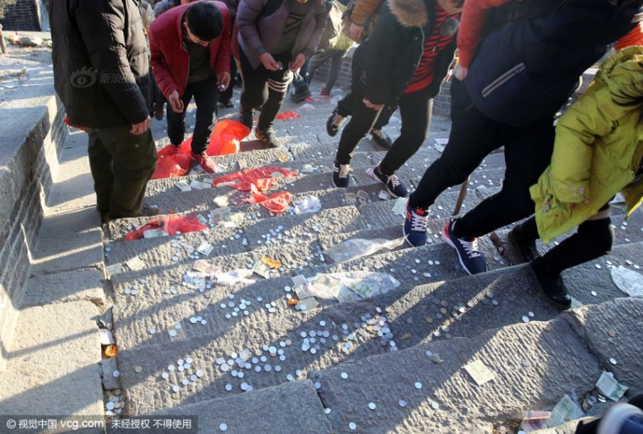 | Dòng người đổ về núi Thái Sơn ở tỉnh Sơn Đông cũng vô cùng đông đúc. Các bậc cầu thang dẫn lên núi ngập tiền lẻ của những người hành hương. Ảnh: VCG |
