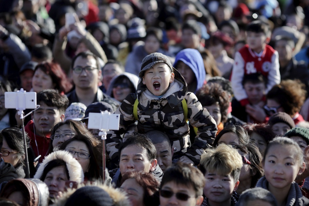 Bé trai được bế lên vai để theo dõi màn biểu diễn tái hiện lễ hội thời nhà Thanh, một trong nhiều hoạt động ở miếu hội du xuân Tết âm lịch 2016. Nhiều hoạt động và lễ hội mùa xuân ở Trung Quốc sẽ được tổ chức cho đến Tết Nguyên tiêu, tức 15/1 âm lịch. Ảnh: Reuters