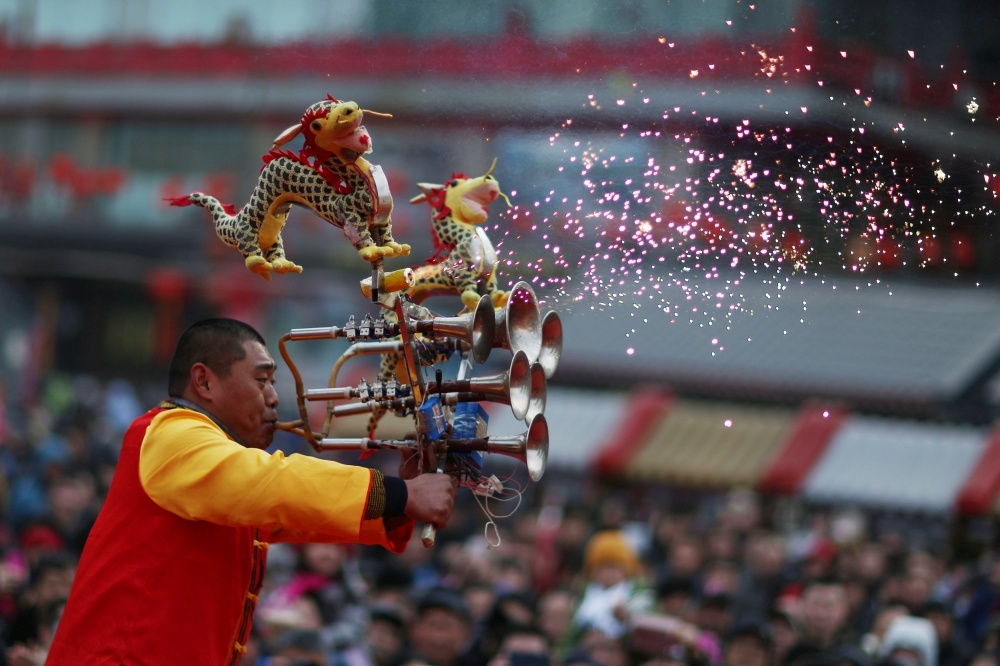 Màn biểu biểu diễn nhạc cụ trong lễ hội năm mới ở một ngôi chùa thuộc thành phố Thẩm Dương, tỉnh Liêu Ninh, thu hút khách du lịch và người dân địa phương. Ảnh: Reuters