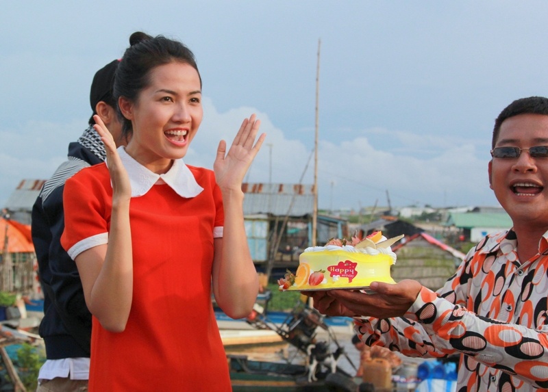 Nhân dịp Phan Thị Mơ mừng tuổi mới, người đẹp đã lẳng lặng đi mua quà và tổ chức sinh nhật cho cô bạn ngay trên trường quay phim "Hai Lúa".