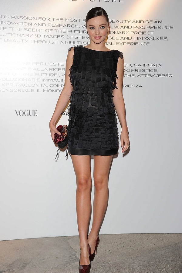 | Xuất hiện trên thảm đỏ của Victoria's Secret Fashion Show 2012 tại New York, Miranda vô cũng thanh lịch trong chiếc váy cổ xẻ sâu của Balmain. Cô kết hợp cùng đôi sandals của Jimmy Choo và clutch đinh tán. |